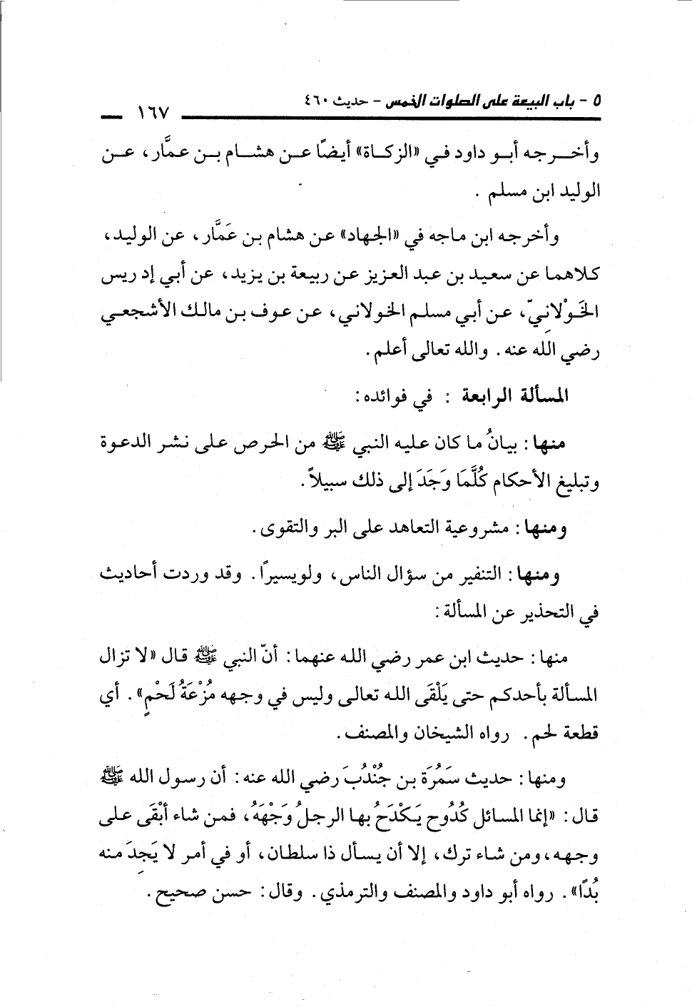 ومنها: حديث سَمُرَة بن جُنْدُبَ رضي الله عنه: أن رسول الله - صلى الله عليه وسلم - قال. "إنما المسائل كُدُوح يَكْدَحُ بها الرجلُ وَجْهَهُ، فمن شاء أبْقَى على وجهه، ومن شاء ترك، إلا أن يسأل ذا سلطان، أو في أمر لا يَجِدَ منه بُدًا". رواه أبو داود والمصنف والترمذي. وقال: حسن صحيح.
