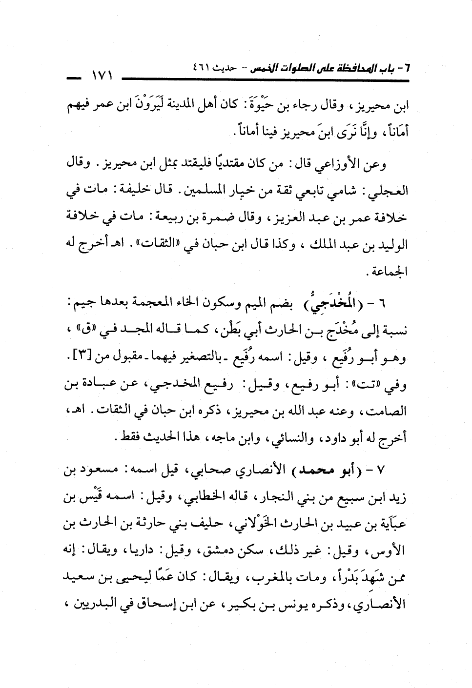 6 - (المُخْدَجِيُّ) بضم الميم وسكون الخاء المعجمة بعدها جيم: نسبة إلى مُخْدَج بن الحارث أبي بَطْن، كما قاله المجد في "ق"، وهو أبو رُفَيع، وقيل: اسمه رُفَيع -بالتصغير فيهما- مقبول من [3]. وفي "تت": أبو رفيع، وقيل: رفيع المخدجي، عن عبادة بن الصامت، وعنه عبد الله بن محيريز، ذكره ابن حبان في الثقات. اهـ، أخرج له أبو داود، والنسائي، وابن ماجه، هذا الحديث فقط.