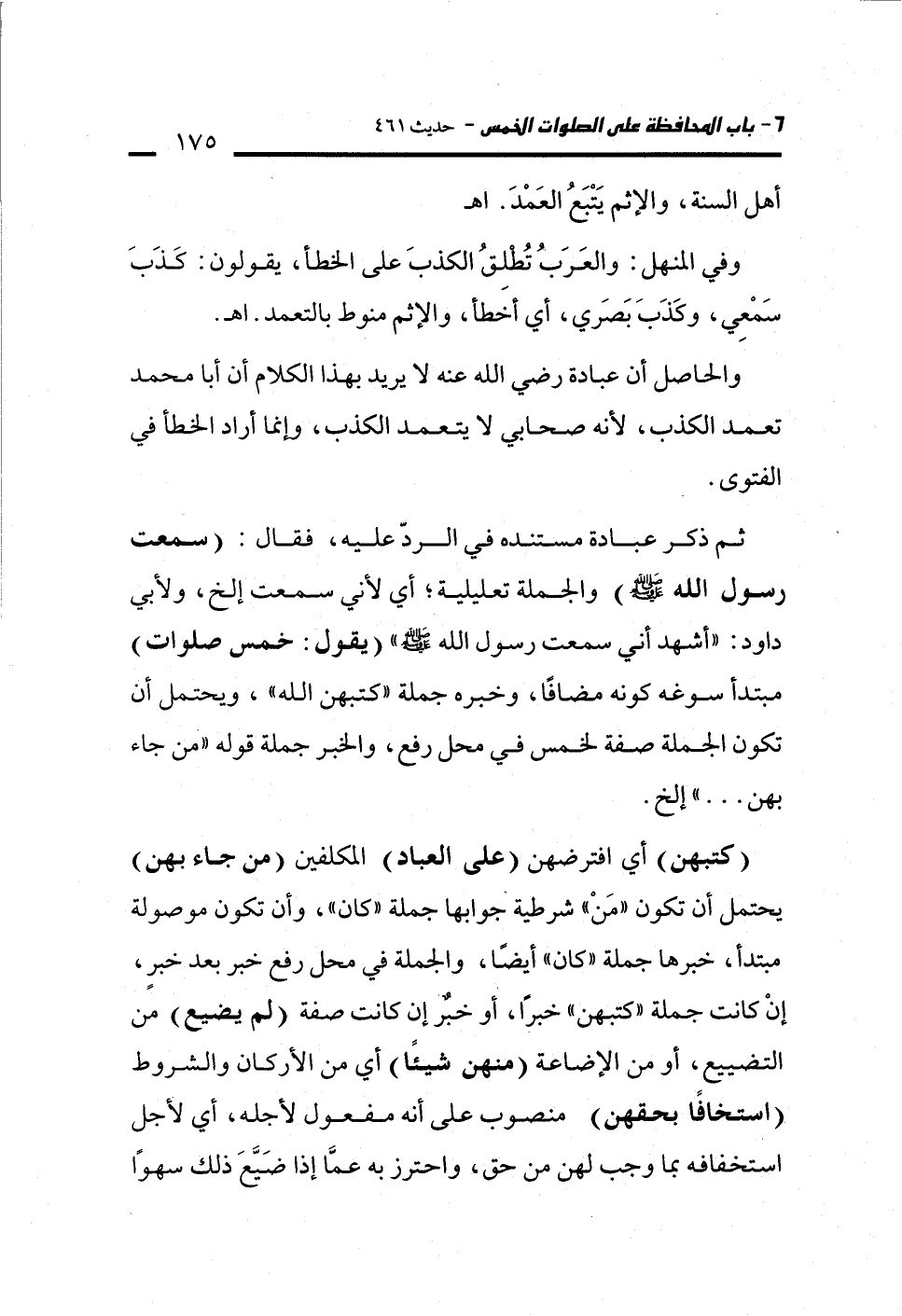 ثم ذكر عبادة مستنده في الردّ عليه، فقال: (سمعت رسول الله - صلى الله عليه وسلم -) والجملة تعليلية؛ أي لأني سمعت إلخ، ولأبي داود: "أشهد أني سمعت رسول الله - صلى الله عليه وسلم -" (يقول: خمس صلوات) مبتدأ سوغه كونه مضافًا، وخبره جملة "كتبهن الله"، ويحتمل أن تكون الجملة صفة لخمس في محل رفع، والخبر جملة قوله "من جاء