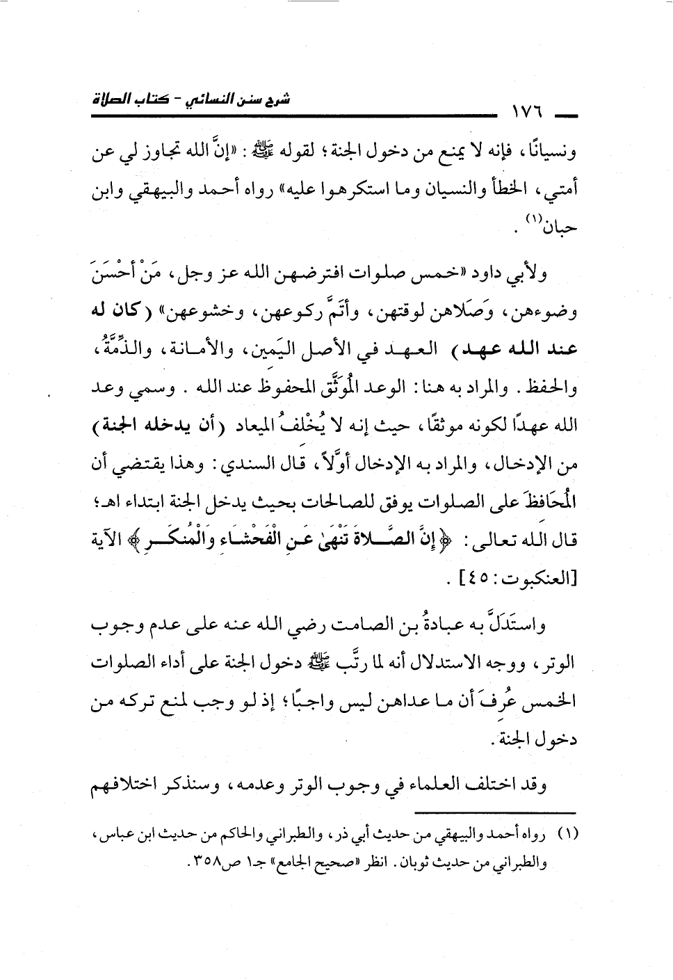 واستَدَلَّ به عبادةُ بن الصامت رضي الله عنه على عدم وجوب الوتر، ووجه الاستدلال أنه لما رتَّب - صلى الله عليه وسلم - دخول الجنة على أداء الصلوات الخمس عُرِفَ أن ما عداهن ليس واجبًا، إذ لو وجب لمنع تركه من دخول الجنة.
