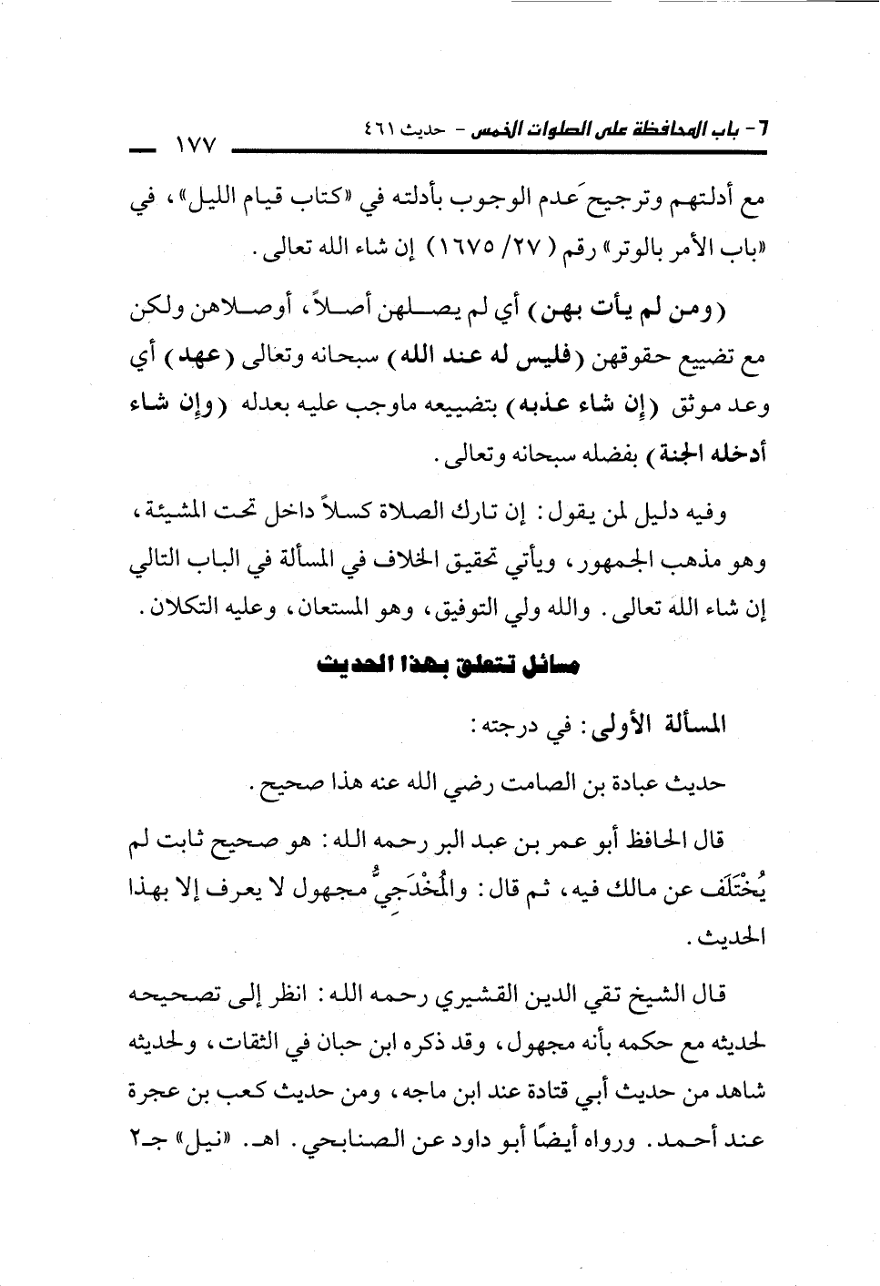 وفيه دليل لمن يقول: إن تارك الصلاة كسلًا داخل تحت المشيئة، وهو مذهب الجمهور، ويأتي تحقيق الخلاف في المسألة في الباب التالي إن شاء الله تعالى. والله ولي التوفيق، وهو المستعان، وعليه التكلان.