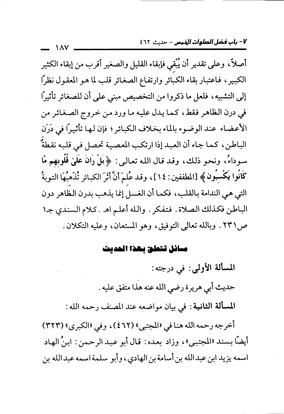 أصلًا، وعلى تقدير أن يُبْقِي فإبقاء القليل والصغير أقرب من إبقاء الكثير الكبير، فاعتبار بقاء الكبائر وارتفاع الصغائر قلب لما هو المعقول نظرًا إلى التشبيه، فلعل ما ذكروا من التخصيص مبني على أن للصغائر تأثيرًا في درن الظاهر فقط، كما يدل عليه ما ورد من خروج الصغائر من الأعضاء عند الوضوء بالماء بخلاف الكبائر؛ فإن لها تأثيرًا في دَرَن الباطن، كما جاء أن العبد إذا ارتكب المعصية تحصل في قلبه نقطةٌ سوداءُ، ونحو ذلك، وقد قال الله تعالى: {بَلْ رَانَ عَلَى قُلُوبِهِمْ مَا كَانُوا يَكْسِبُونَ} [المطففين: 14]، وقد عُلمَ أنَّ أثَرَ الكبائر تُذْهبُهَا التوبةُ التي هي الندامة بالقلب، فكما أن الغسلَ إنما يذهب بدرن الظَاهر دون الباطن فكذلك الصلاة. فتفكر. والله أعلم اهـ. كلام السندي جـ 1 ص 231. وبالله تعالى التوفيق، وهو المستعان، وعليه التكلان.
