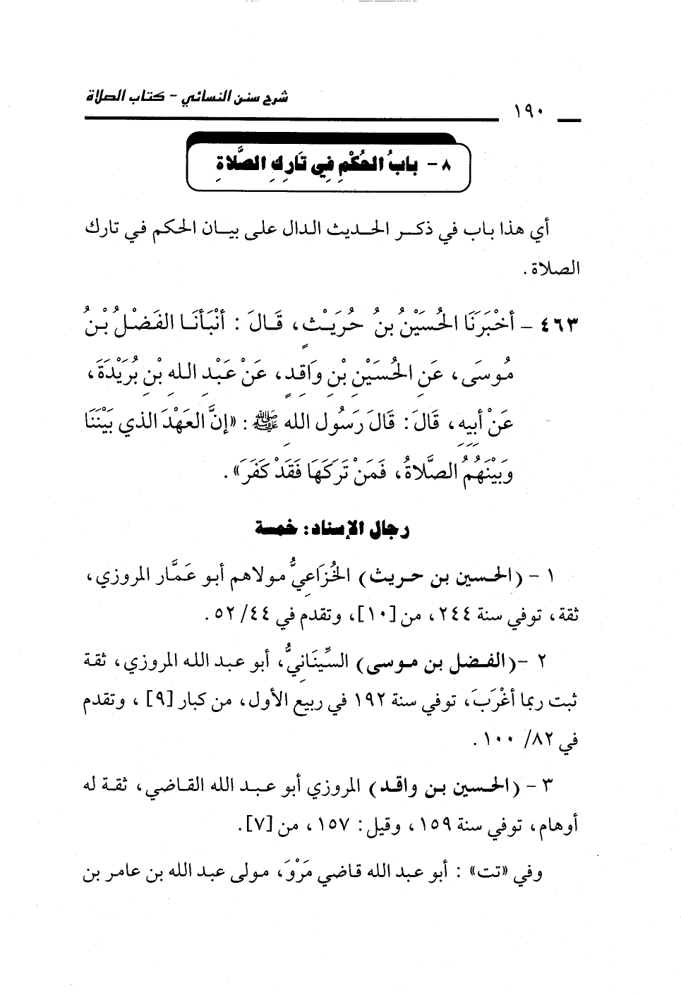 463 - أَخْبَرَنَا الْحُسَيْنُ بْنُ حُرَيْثٍ، قَالَ: أَنْبَأَنَا الْفَضْلُ بْنُ مُوسَى، عَنِ الْحُسَيْنِ بْنِ وَاقِدٍ، عَنْ عَبْدِ اللهِ بْنِ بُرَيْدَةَ، عَنْ أَبِيهِ، قَالَ: قَالَ رَسُولُ اللهِ - صلى الله عليه وسلم -: "إِنَّ الْعَهْدَ الَّذِي بَيْنَنَا وَبَيْنَهُمُ الصَّلاَةُ، فَمَنْ تَرَكَهَا فَقَدْ كَفَرَ".