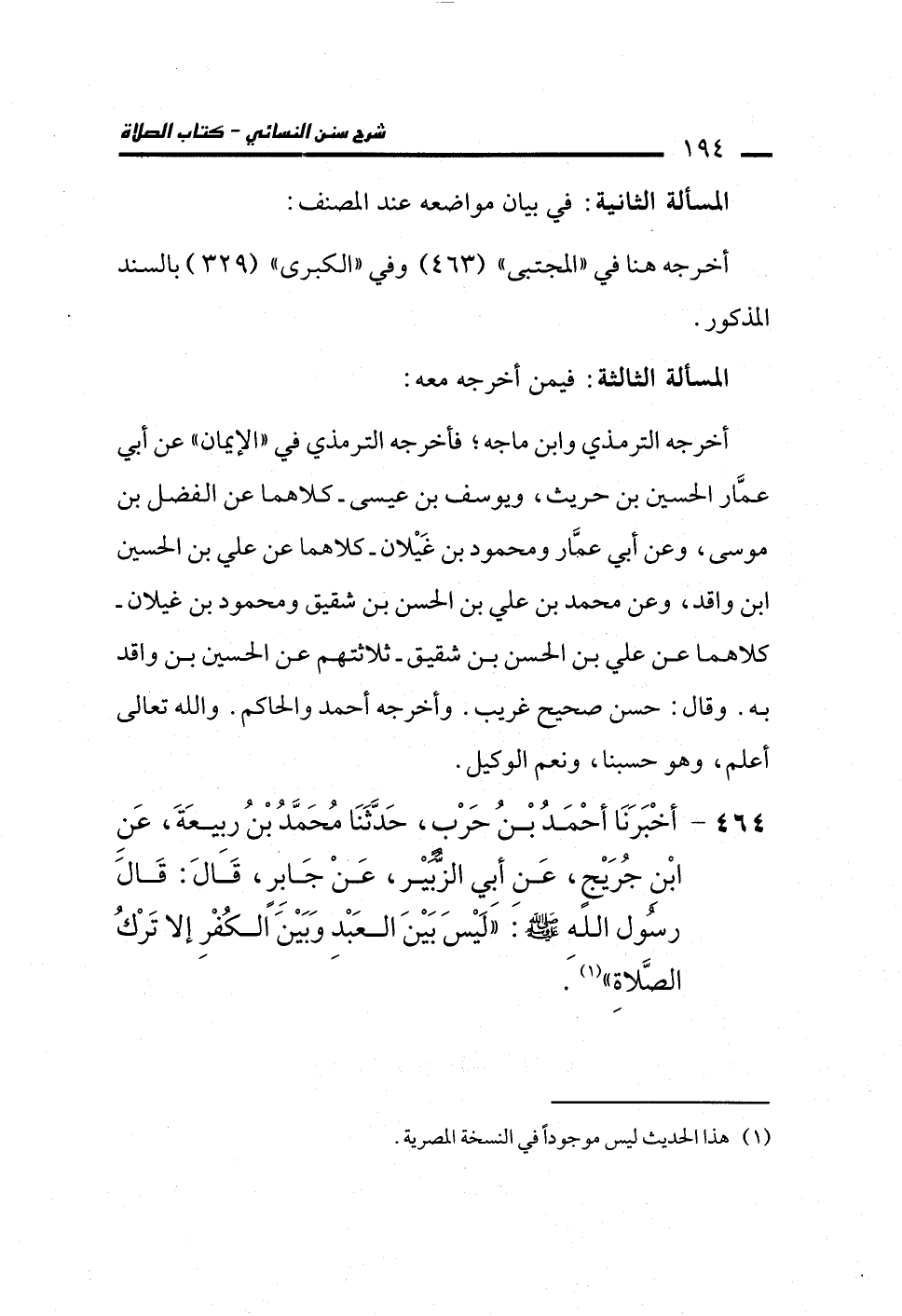 464 - أَخْبَرَنَا أَحْمَدُ بْنُ حَرْبٍ، حَدَّثَنَا مُحَمَّدُ بْنُ رَبِيعَةَ، عَنِ ابْنِ جُرَيْجٍ، عَنْ أَبِي الزُّبَيْرِ، عَنْ جَابِرٍ، قَالَ: قَالَ رَسُولُ اللهِ - صلى الله عليه وسلم -: "لَيْسَ بَيْنَ الْعَبْدِ وَبَيْنَ الْكُفْرِ إِلاَّ تَرْكُ الصَّلاَةِ" (¬1).
