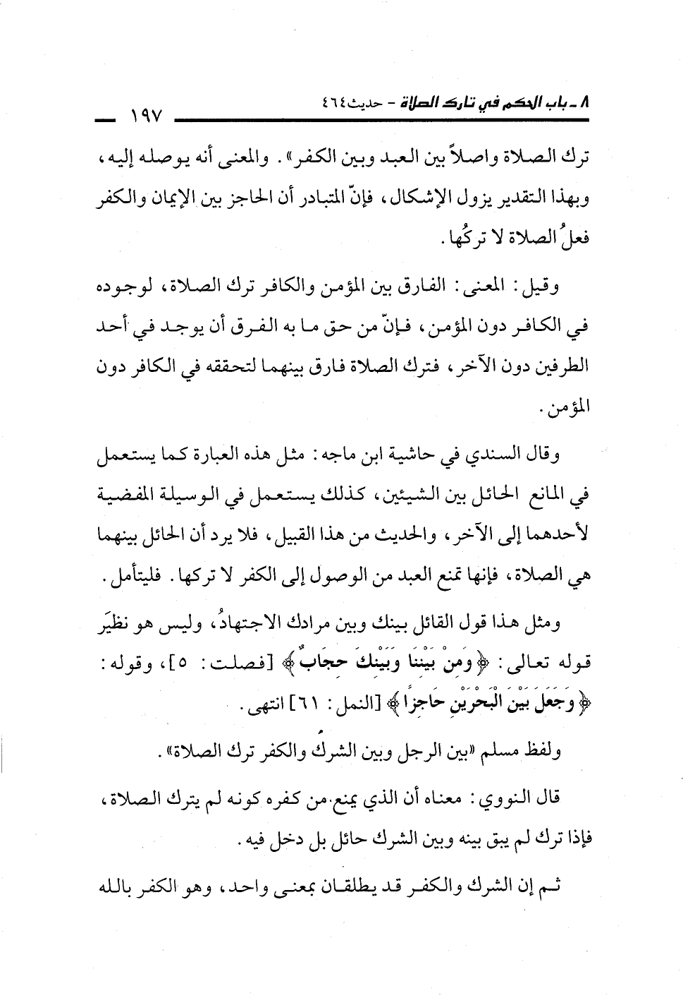 وقال السندي في حاشية ابن ماجه: مثل هذه العبارة كما يستعمل في المانع الحائل بين الشيئين، كذلك يستعمل في الوسيلة المفضية لأحدهما إلى الآخر، والحديث من هذا القبيل، فلا يرد أن الحائل بينهما هي الصلاة، فإنها تمنع العبد من الوصول إلى الكفر لا تركها. فليتأمل.