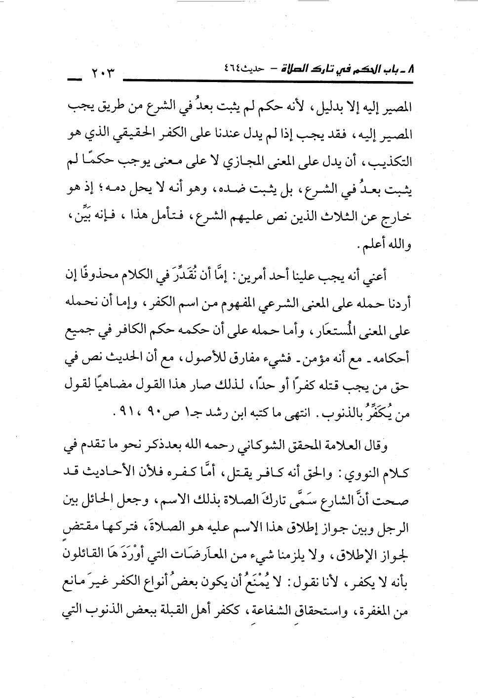 وقال العلامة المحقق الشوكاني رحمه الله بعد ذكر نحو ما تقدم في كلام النووي: والحق أنه كافر يقتل، أمَّا كفره فلأن الأحاديث قد صحت أنَّ الشارع سَمَّى تاركَ الصلاة بذلك الاسم، وجعل الحائل بين الرجل وبين جواز إطلاق هذا الاسم عليه هو الصلاةَ، فتركها مقتضٍ لجواز الإطلاق، ولا يلزمنا شيء من المعاَرضَات التي أوْرَدَ هَا القائلون بأنه لا يكفر، لأنا نقول: لا يُمْنَعُ أن يكون بعضُ أنواع الكفر غيرَ مانع من المغفرة، واستحقاقِ الشفاعةِ، ككفر أهل القبلة ببعض الذنوب التي