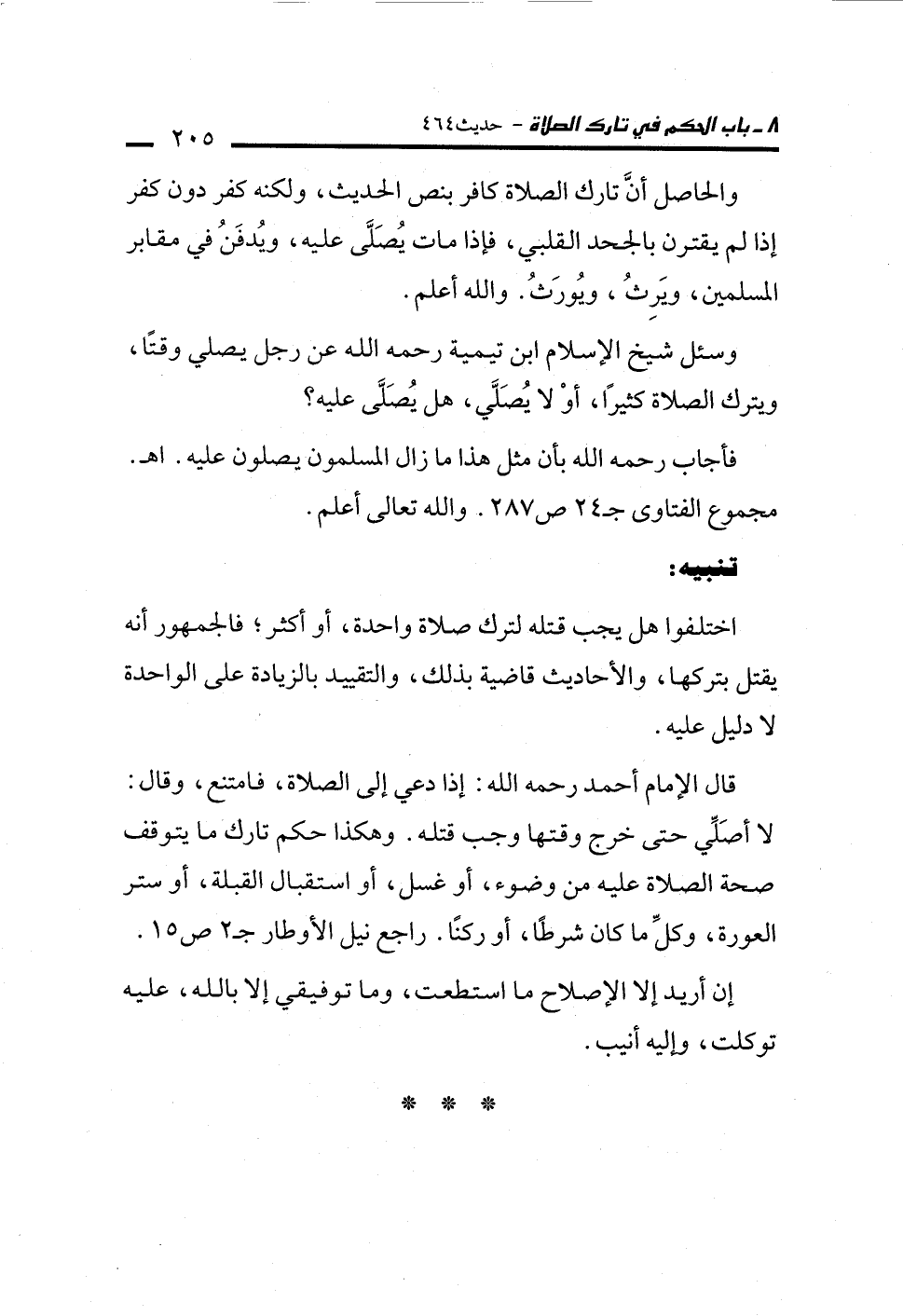 اختلفوا هل يجب قتله لترك صلاة واحدة، أو أكثر؛ فالجمهور أنه يقتل بتركها، والأحاديث قاضية بذلك، والتقييد بالزيادة على الواحدة لا دليل عليه.