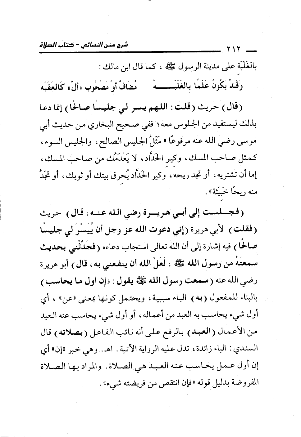 (فجلست إِلى أبي هريرة رضي الله عنه، قال) حريث (فقلت) لأبي هريرة (إِني دعوت الله عز وجل أن يُيَسِّرَ لي جليسًا صالحًا) فيه إشارة إلى أن الله تعالى استجاب دعاءه (فحَدِّثْني بحديت سمعتَهُ من رسول الله - صلى الله عليه وسلم -، لَعَلَّ الله أن ينفعني به، قال) أبو هريرة رضي الله عنه (سمعت رسول الله - صلى الله عليه وسلم - يقول: "إِن أول ما يحاسب) بالبناء للمفعول (به) الباء سببية، ويحتمل كونها بمعنى "عن"، أي أول شيء يحاسب به العبد من أعماله، أو أول شيء يحاسب عنه العبد من الأعمال (العبد) بالرفع على أنه نائب الفاعل (بصلاته) قال السندي: الباء زائدة، تدل عليه الرواية الآتية. اهـ. وهي خبر "إن" أي إن أول عمل يحاسب عنه العبد هي الصلاة. ولمراد بها الصلاة المفروضة بدليل قوله "فإن انتقص من فريضته شيء".