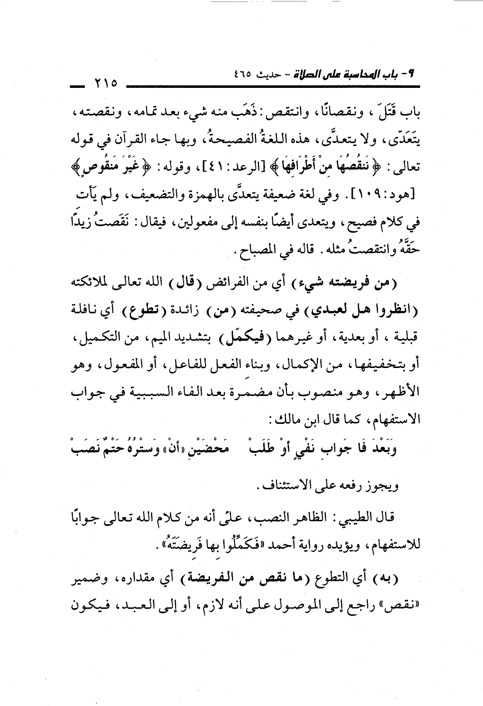 قال الطيبي: الظاهر النصب، على أنه من كلام الله تعالى جوابًا للاستفهام، ويؤيده رواية أحمد "فَكَمِّلُوا بِها فَرِيضَتَهُ".