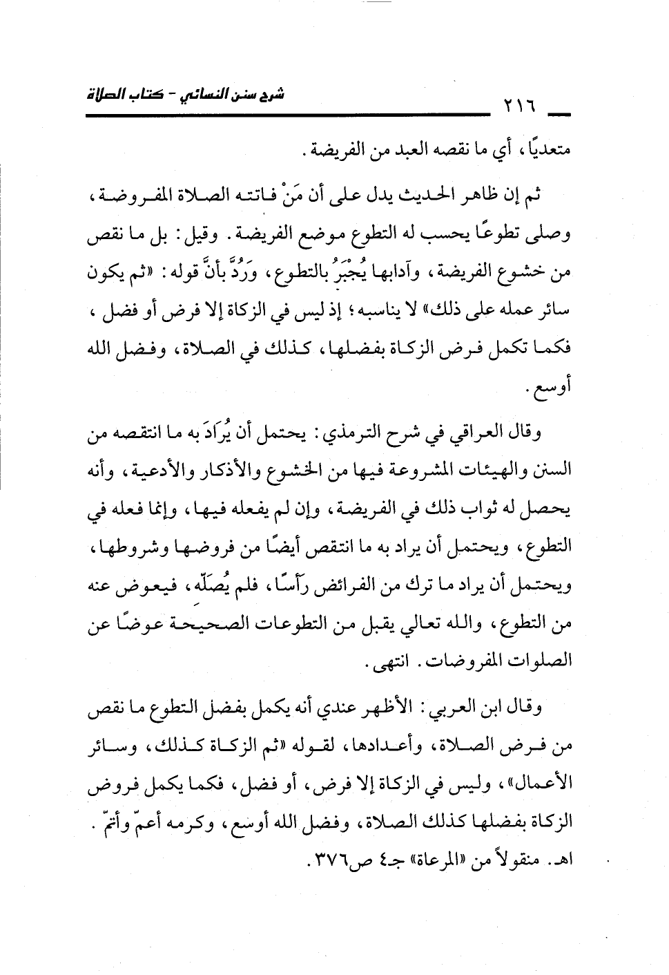 وقال ابن العربي: الأظهر عندي أنه يكمل بفضل التطوع ما نقص من فرض الصلاة، وأعدادها، لقوله "ثم الزكاة كذلك، وسائر الأعمال"، وليس في الزكاة إلا فرض، أو فضل، فكما يكمل فروض الزكاة بفضلها كذلك الصلاة، وفضل الله أوسع، وكرمه أعمّ وأتمّ. اهـ. منقولًا من "المرعاة" جـ 4 ص 376.