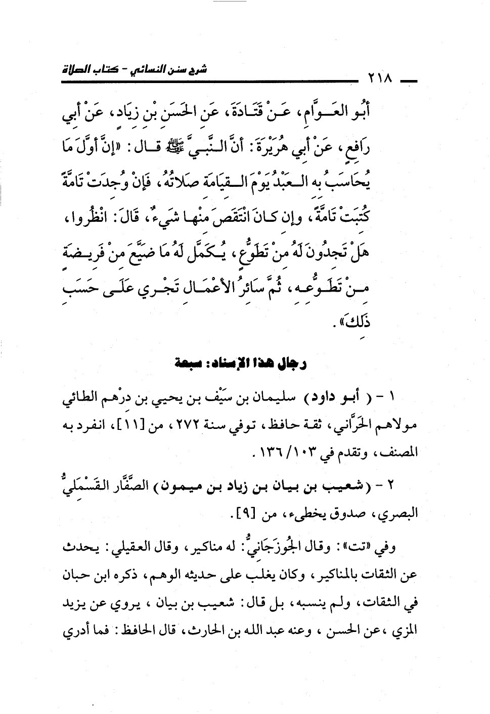أَبُو الْعَوَّامِ، عَنْ قَتَادَةَ، عَنِ الْحَسَنِ، عَنْ أَبِي رَافِعٍ، عَنْ أَبِي هُرَيْرَةَ: أَنَّ النَّبِيَّ - صلى الله عليه وسلم - قَالَ: "إِنَّ أَوَّلَ مَا يُحَاسَبُ بِهِ الْعَبْدُ يَوْمَ الْقِيَامَةِ صَلاَتُهُ، فَإِنْ وُجِدَتْ تَامَّةً كُتِبَتْ تَامَّةً، وَإِنْ كَانَ انْتَقَصَ مِنْهَا شَيْءٌ، قَالَ: انْظُرُوا هَلْ تَجِدُونَ لَهُ مِنْ تَطَوُّعٍ، يُكَمِّلُ لَهُ مَا ضَيَّعَ مِنْ فَرِيضَةٍ مِنْ تَطَوُّعِهِ، ثُمَّ سَائِرُ الأَعْمَالِ تَجْرِى عَلَى حَسَبِ ذَلِكَ".
