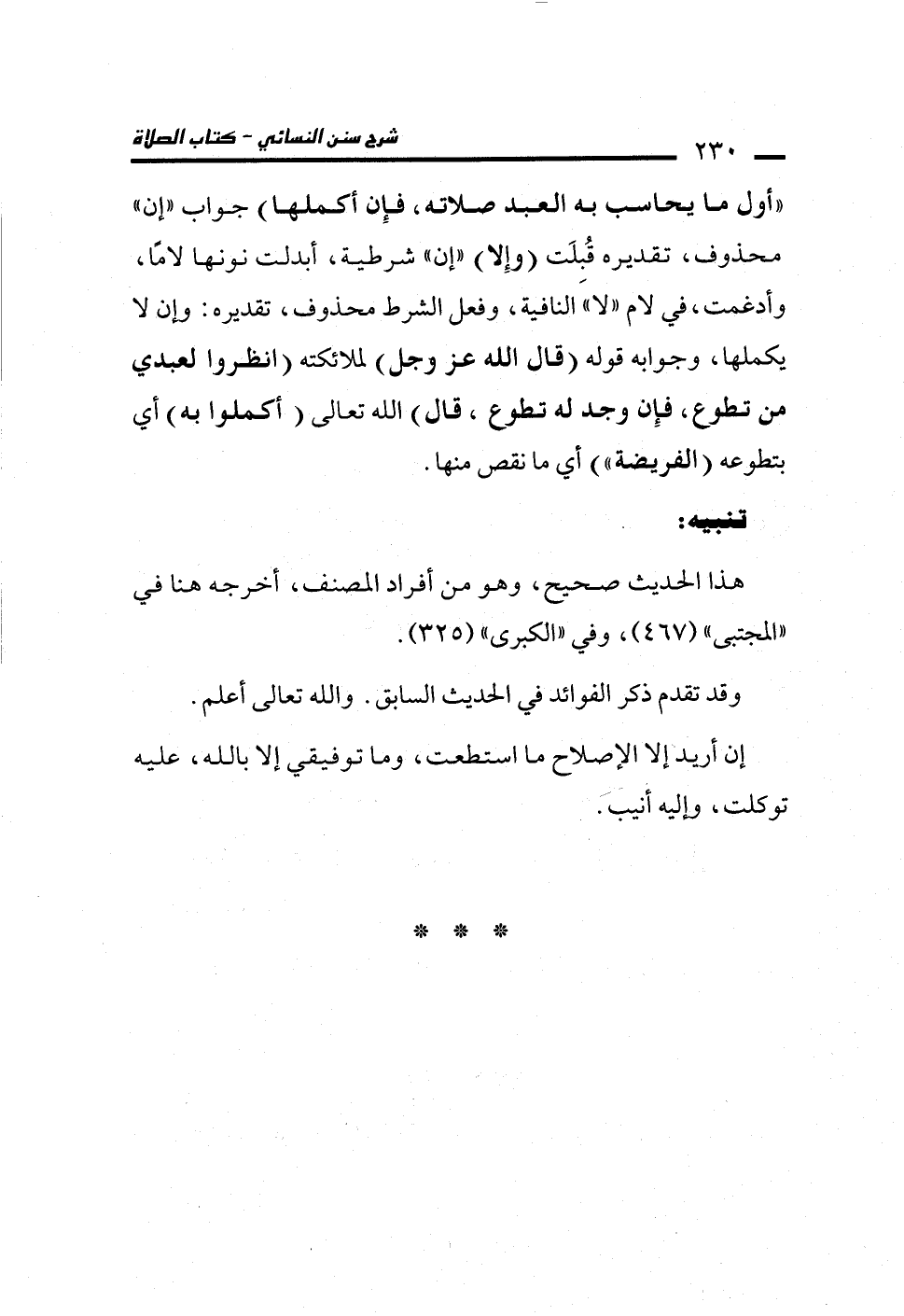 أول ما يحاسب به العبد صلاته، فإِن أكملها" جواب "إن" محذوف، تقديره قُبِلَت (وإِلا) "إن" شرطية، أبدلت نونها لامًا، وأدغمت، في لام "لا" النافية، وفعل الشرط محذوف، تقديره: وإن لا يكملها، وجوابه قوله (قال الله عز وجل) لملائكته (انظروا لعبدي من تطوع، فإِن وجد له تطوع، قال) الله تعالى (أكملوا به) أي بتطوعه (الفريضة) أي ما نقص منها.