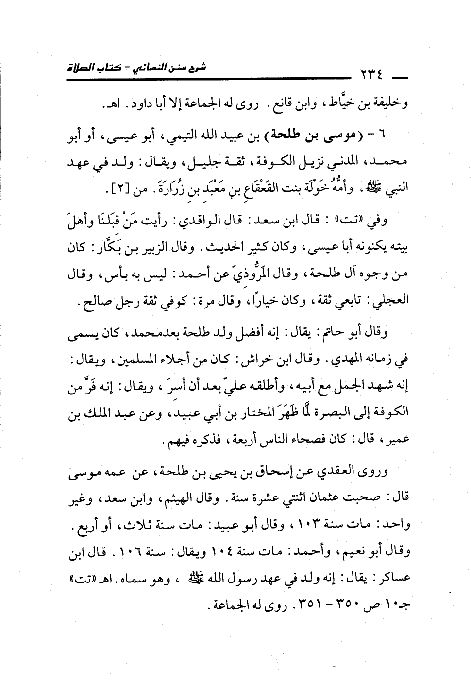 6 - (موسى بن طلحة) بن عبيد الله التيمي، أبو عيسى، أو أبو محمد، المدني نزيل الكوفة، ثقة جليل، ويقال: ولد في عهد النبي - صلى الله عليه وسلم -، وأمُّهُ خَوْلَة بنت القَعْقَاعِ بن مَعْبَدِ بنِ زُرَارَةَ. من [2].