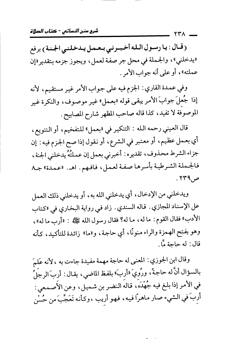 قال العيني رحمه الله: التنكير في "بعمل" للتفخيم، أو التنويع، أي بعمل عظيم، أو معتبر في الشرع، أو نقول إذا صح الجزم فيه: إن جزاء الشرط محذوف، تقديره: أخبرني بعمل إن عملتُهُ يدخلني الجنة، فالجملة الشرطية بأسرها صفة لعمل، فافهم. اهـ. "عمدة" جـ 8 ص 239.
