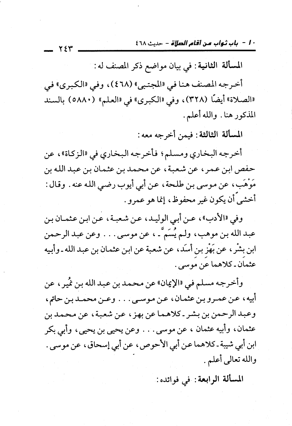 أخرجه المصنف هنا في "المجتبى" (468)، وفي "الكبرى" في "الصلاة" أيضًا (328)، وفي "الكبرى" في "العلم" (5880) بالسند المذكور هنا. والله أعلم.