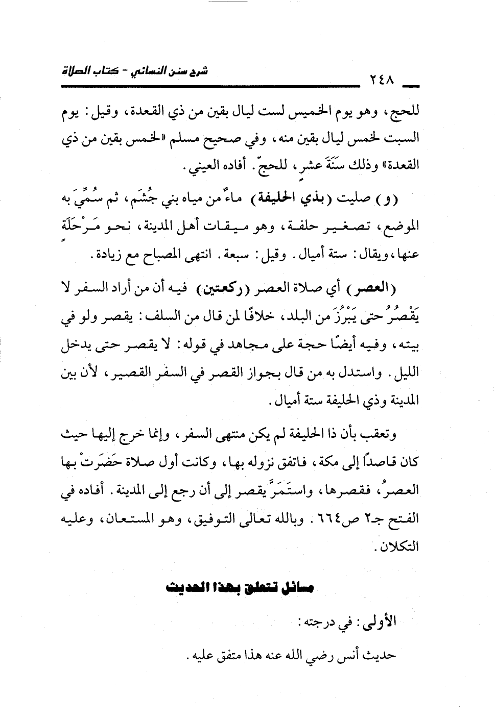 وتعقب بأن ذا الحليفة لم يكن منتهى السفر، وإنما خرج إليها حيث كان قاصدًا إلى مكة، فاتفق نزوله بها، وكانت أول صلاة حَضَرتْ بها العصرُ، فقصرها، واستَمَرَّ يقصر إلى أن رجع إلى المدينة. أفاده في الفتح جـ 2 ص 664. وبالله تعالى التوفيق، وهو المستعان، وعليه