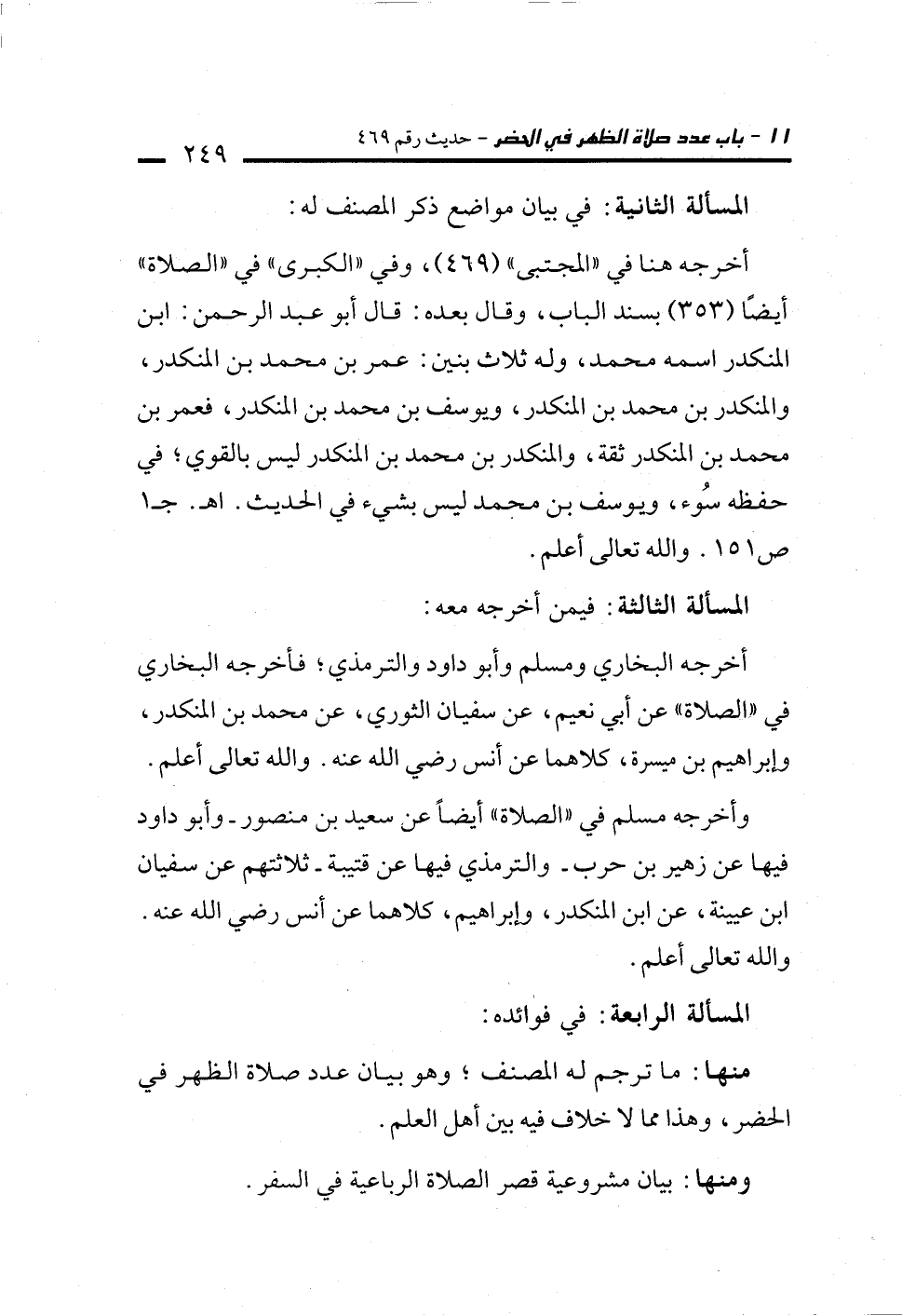 أخرجه هنا في "المجتبى" (469)، وفي "الكبرى" في "الصلاة" أيضا (353) بسند الباب، وقال بعده: قال أبو عبد الرحمن: ابن المنكدر اسمه محمد، وله ثلاث بنين: عمر بن محمد بن المنكدر، والمنكدر بن محمد بن المنكدر، ويوسف بن محمد بن المنكدر، فعمر بن محمد بن المنكدر ثقة، والمنكدر بن محمد بن المنكدر ليس بالقوي؛ في حفظه سُوء، ويوسف بن محمد ليس بشيء في الحديث. اهـ. جـ 1 ص 151. والله تعالى أعلم.