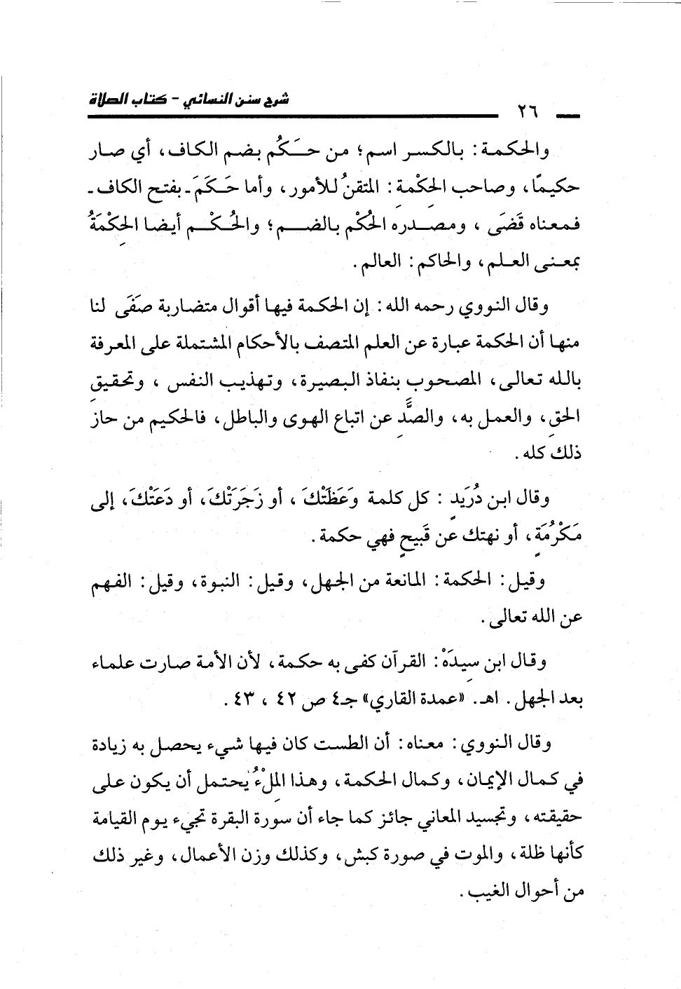 وقال النووي رحمه الله: إن الحكمة فيها أقوال متضاربة صَفَى لنا منها أن الحكمة عبارة عن العلم المتصف بالأحكام المشتملة على المعرفة بالله تعالى، المصحوب بنفاذ البصيرة، وتهذيب النفس، وتحقيقِ الحقِ، والعمل به، والصَّدِ عن اتباع الهوى والباطل، فالحكيم من حاز ذلك كله.