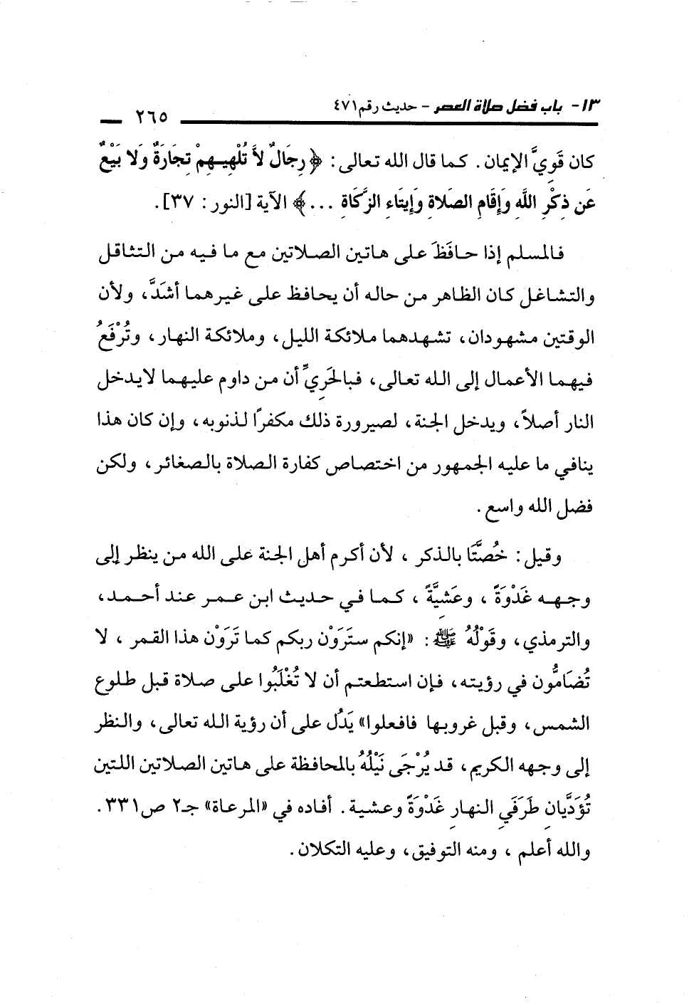 وقيل: خُصَّتَا بالذكر، لأن أكرم أهل الجنة على الله من ينظر الى وجهه غَدْوَة، وعَشِيَّةً، كما في حديث ابن عمر عند أحمد، والترمذي، وقَوْلُهُ - صلى الله عليه وسلم -: "إنكم ستَرَوْن ربكم كما تَرَوْن هذا القمر، لا تُضَامُّون في رؤيته، فإن استطعتم أن لا تُغْلَبُوا على صلاة قبل طلوع الشمس، وقبل غروبها فافعلوا" يَدُل على أن رؤية الله تعالى، والنظر إلى وجهه الكريم، قد يُرْجَى نَيْلُهُ بالمحافظة على هاتين الصلاتين اللتين تُؤَدَّيانِ طَرَفَيِ النهارِ غَدْوَةً وعشية. أفاده في "المرعاة" جـ 2 ص 331. والله أعلم، ومنه التوفيق، وعليه التكلان.
