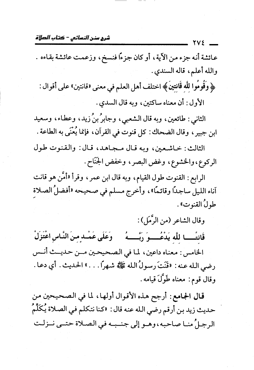 الرابع: القنوت طول القيام، وبه قال ابن عمر، وقرأ "أمَّن هو قانت آناء الليل ساجدًا وقائمًا"، وأخرج مسلم في صحيحه "أفضلُ الصلاةِ طولُ القنوت".