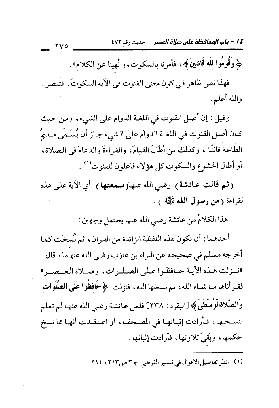 فهذا نص ظاهر في كون معنى القنوت في الآية السكوتَ. فتبصر. والله أعلم.