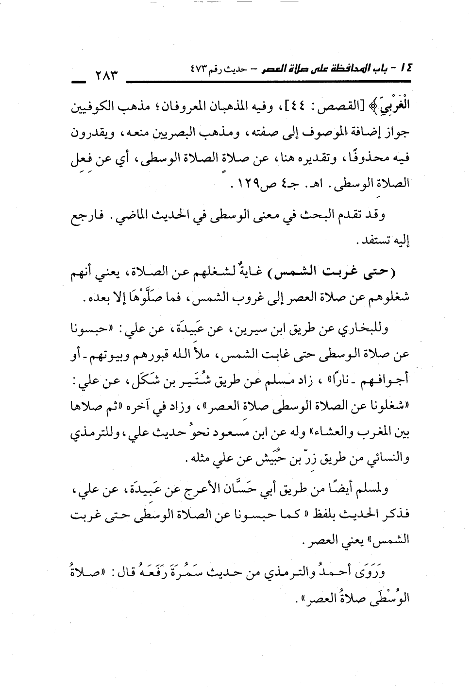 وللبخاري عن طريق ابن سيرين، عن عَبيدَة، عن علي: "حبسونا عن صلاة الوسطى حتى غابت الشمس، ملأَ الله قبورهم وبيوتهم -أو أجوافهم- نارًا"، زاد مسلم عن طريق شُتَير بن شَكَل، عن علي: "شغلونا عن الصلاة الوسطى صلاةِ العصر"، وزاد في آخره "ثم صلاها