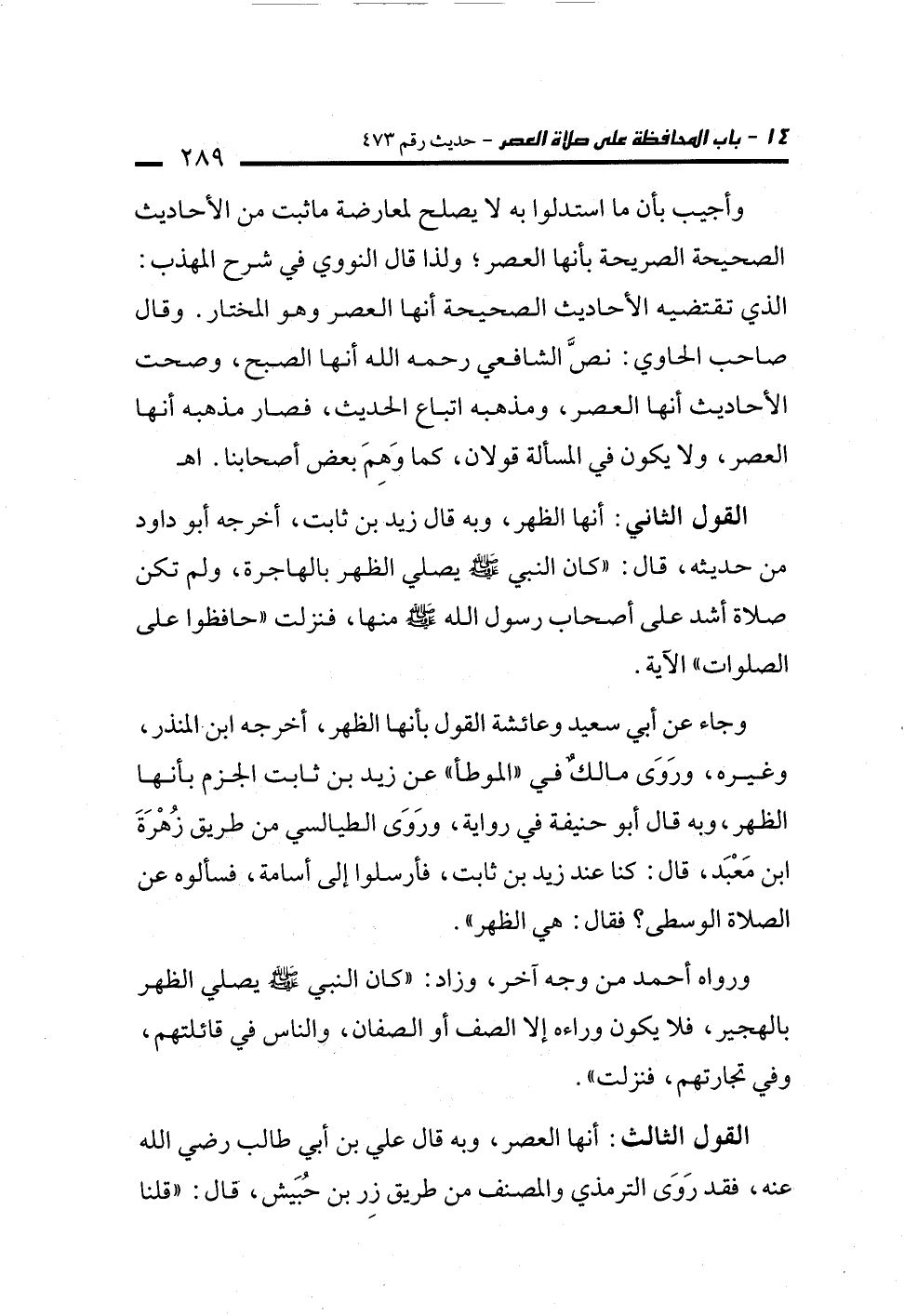 القول الثالث: أنها العصر، وبه قال علي بن أبي طالب رضي الله عنه، فقد رَوَى الترمذي والمصنف من طريق زِر بن حُبَيش، قال: "قلنا