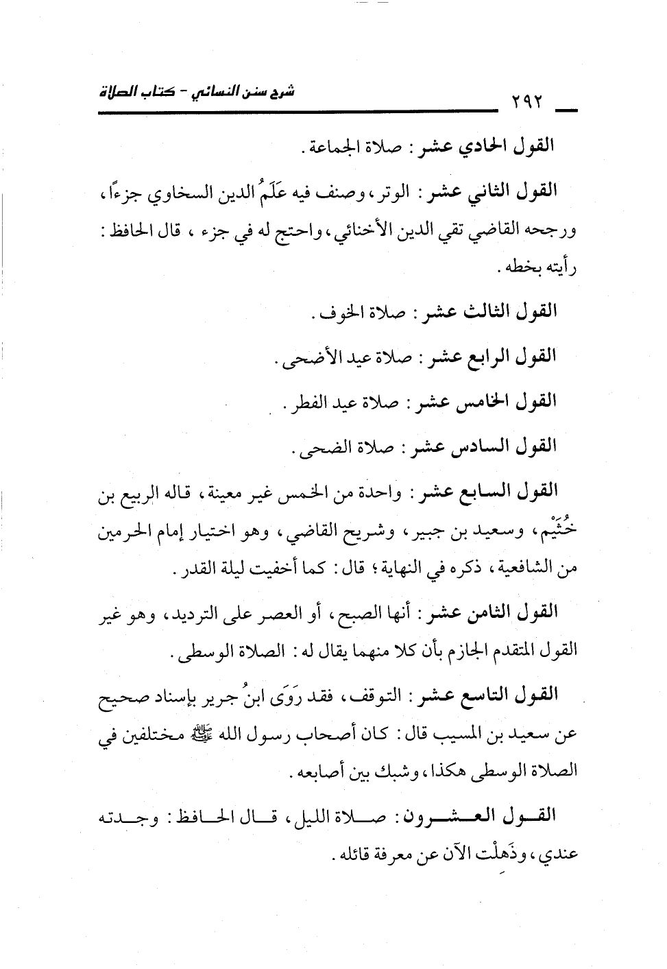 القول التاسع عشر: التوقف، فقد رَوَى ابنُ جرير بإسناد صحيح عن سعيد بن المسيب قال: كان أصحاب رسول الله - صلى الله عليه وسلم - مختلفين في الصلاة الوسطى هكذا، وشبك بين أصابعه.