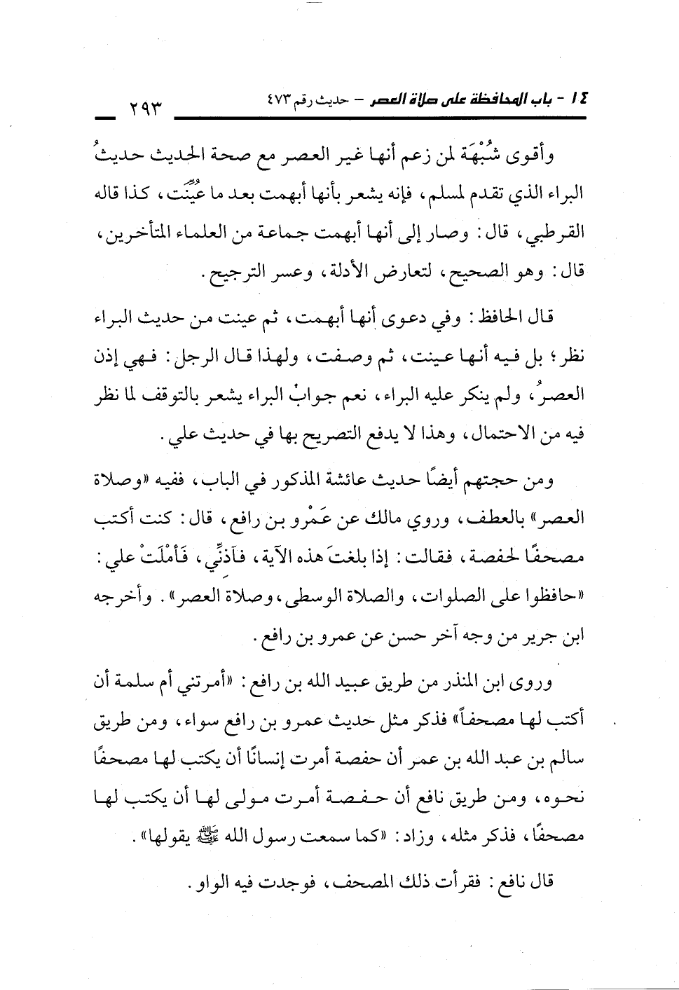 قال الحافظ: وفي دعوى أنها أبهمت، ثم عينت من حديث البراء نظر؛ بل فيه أنها عينت، ثم وصفت، ولهذا قال الرجل: فهي إذن العصرُ، ولم ينكر عليه البراء، نعم جواب البراء يشعر بالتوقف لما نظر فيه من الاحتمال، وهذا لا يدفع التصريح بها في حديث علي.