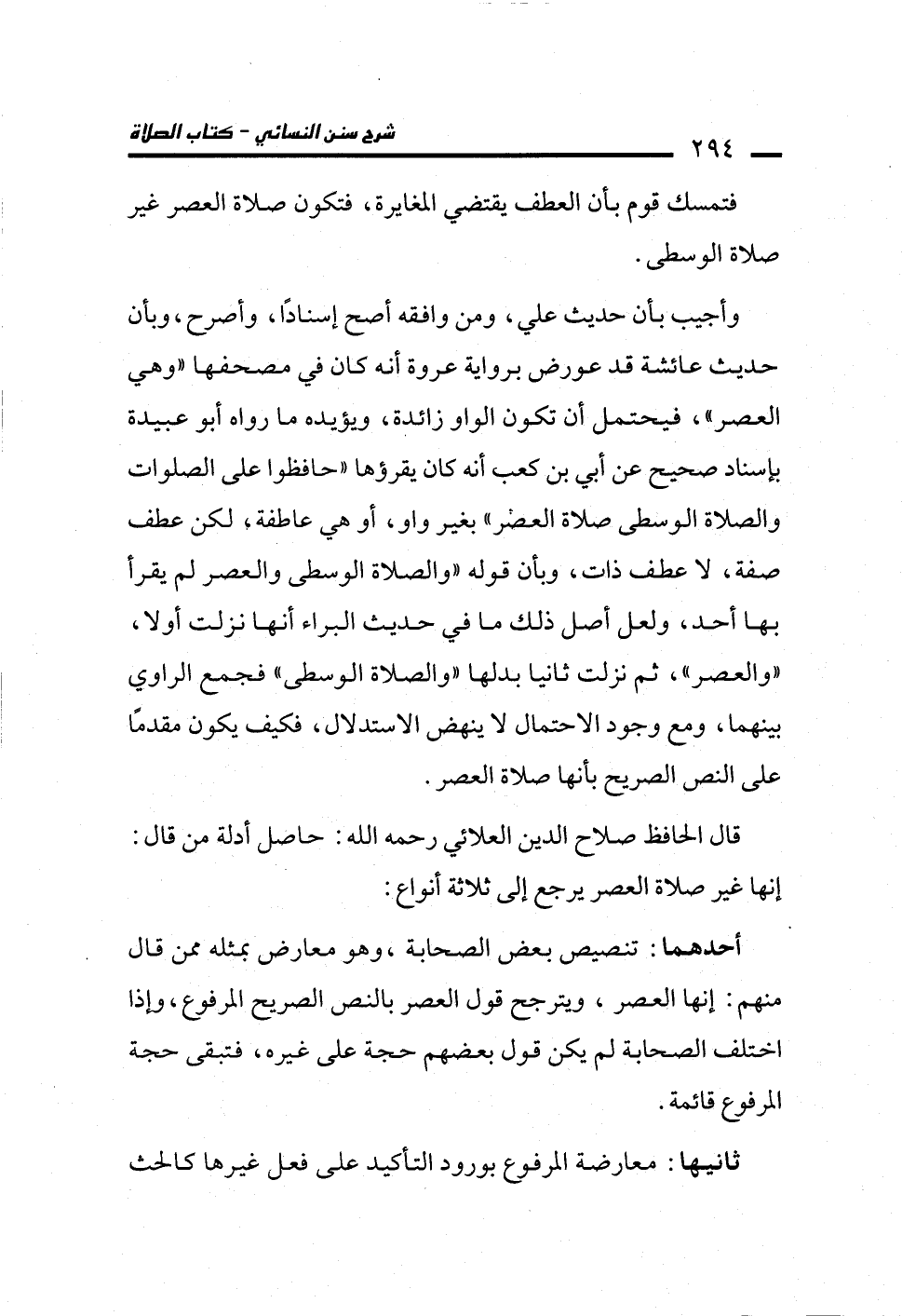 وأجيب بأن حديث علي، ومن وافقه أصح إسنادًا، وأصرح، وبأن حديث عائشة قد عورض برواية عروة أنه كان في مصحفها "وهي العصر"، فيحتمل أن تكون الواو زائدة، ويؤيده ما رواه أبو عبيدة بإسناد صحيح عن أبي بن كعب أنه كان يقرؤها "حافظوا على الصلوات والصلاة الوسطى صلاة العصر" بغير واو، أو هي عاطفة، لكن عطف صفة، لا عطف ذات، وبأن قوله "والصلاة الوسطى والعصر لم يقرأ بها أحد، ولعل أصل ذلك ما في حديث البراء أنها نزلت أولا، "والعصر"، ثم نزلت ثانيا بدلها "والصلاة الوسطى" فجمع الراوي بينهما، ومع وجود الاحتمال لا ينهض الاستدلال، فكيف يكون مقدمًا على النص الصريح بأنها صلاة العصر.