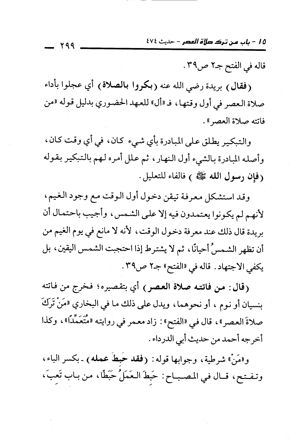 (فقال) بريدة رضي الله عنه (بكروا بالصلاة) أي عجلوا بأداء صلاة العصر في أول وقتها، فـ "أل" للعهد الحضوري بدليل قوله "من فاتته صلاة العصر".