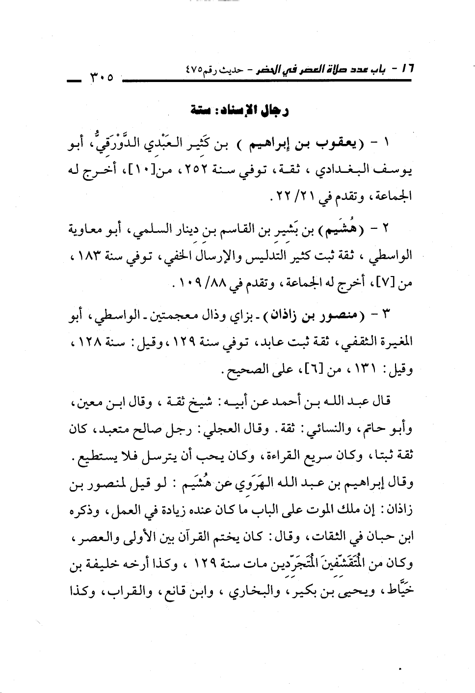 3 - (منصور بن زاذان) -بزاي وذال معجمتين- الواسطي، أبو المغيرة الثقفي، ثقة ثبت عابد، توفي سنة 129، وقيل: سنة 128، وقيل: 131، من [6]، على الصحيح.