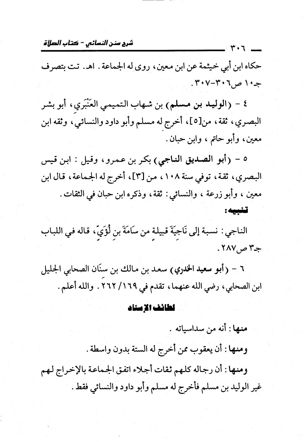 ومنها: أن رجاله كلهم ثقات أجلاء اتفق الجماعة بالإخراج لهم غير الوليد بن مسلم فأخرج له مسلم وأبو داود والنسائي فقط.