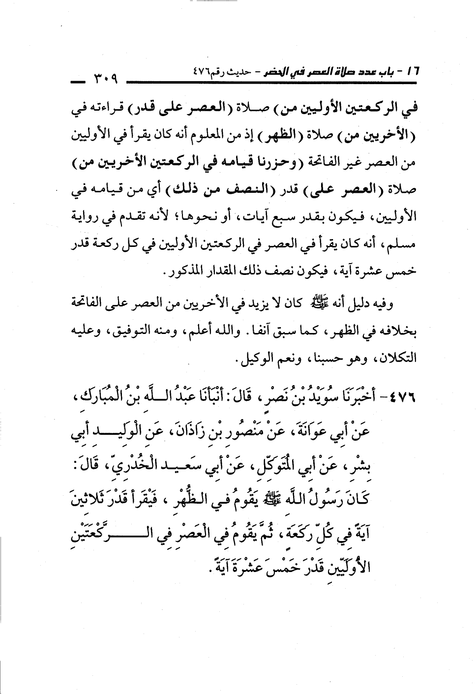 476 - أَخْبَرَنَا سُوَيْدُ بْنُ نَصْرٍ، قَالَ: أَنْبَأَنَا عَبْدُ اللهِ بْنُ الْمُبَارَكِ، عَنْ أَبِي عَوَانَةَ، عَنْ مَنْصُورِ بْنِ زَاذَانَ، عَنِ الْوَلِيدِ أَبِي بِشْرٍ، عَنْ أَبِي الْمُتَوَكِّلِ، عَنْ أَبِي سَعِيدٍ الْخُدْرِيِّ، قَالَ: كَانَ رَسُولُ اللهِ - صلى الله عليه وسلم - يَقُومُ فِي الظُّهْرِ، فَيَقْرَأُ قَدْرَ ثَلاَثِينَ آيَةً فِي كُلِّ رَكْعَةٍ، ثُمَّ يَقُومُ فِي الْعَصْرِ فِي الرَّكْعَتَيْنِ الأُولَيَيْنِ قَدْرَ خَمْسَ عَشْرَةَ آيَةً.