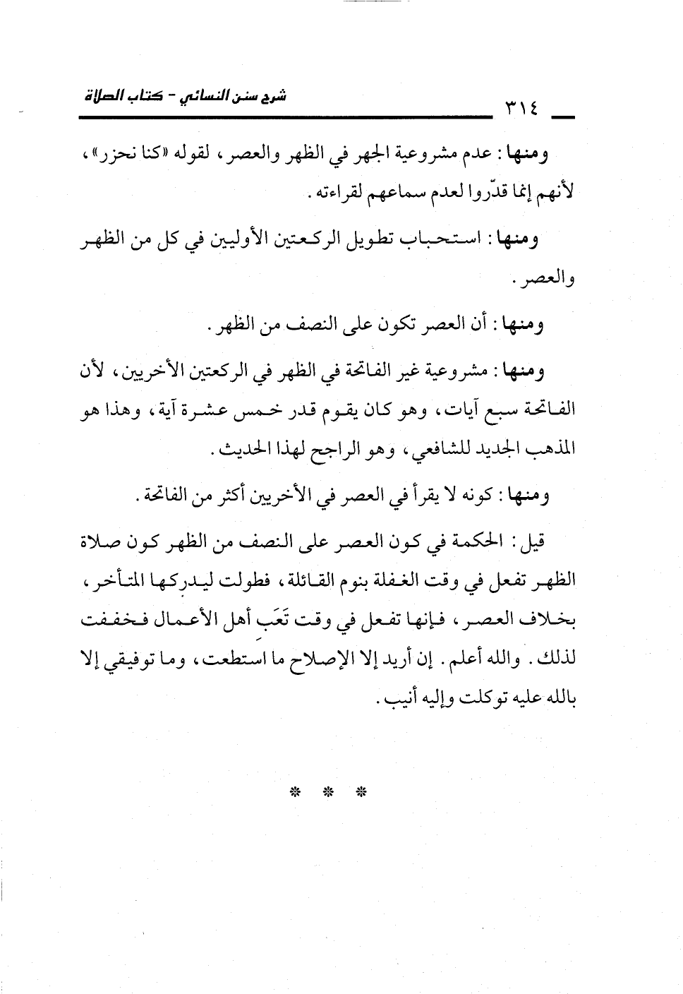 قيل: الحكمة في كون العصر على النصف من الظهر كون صلاة الظهر تفعل في وقت الغفلة بنوم القائلة، فطولت ليدركها المتأخر، بخلاف العصر، فإنها تفعل في وقت تَعَبِ أهل الأعمال فخففت لذلك. والله أعلم. إن أريد إلا الإصلاح ما استطعت، وما توفيقي إلا