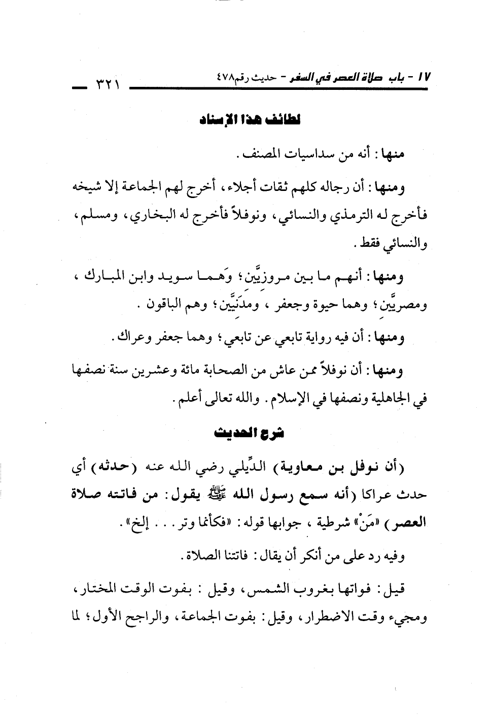 ومنها: أن رجاله كلهم ثقات أجلاء، أخرج لهم الجماعة إلا شيخه فأخرج له الترمذي والنسائي، ونوفلًا فأخرج له البخاري، ومسلم، والنسائي فقط.