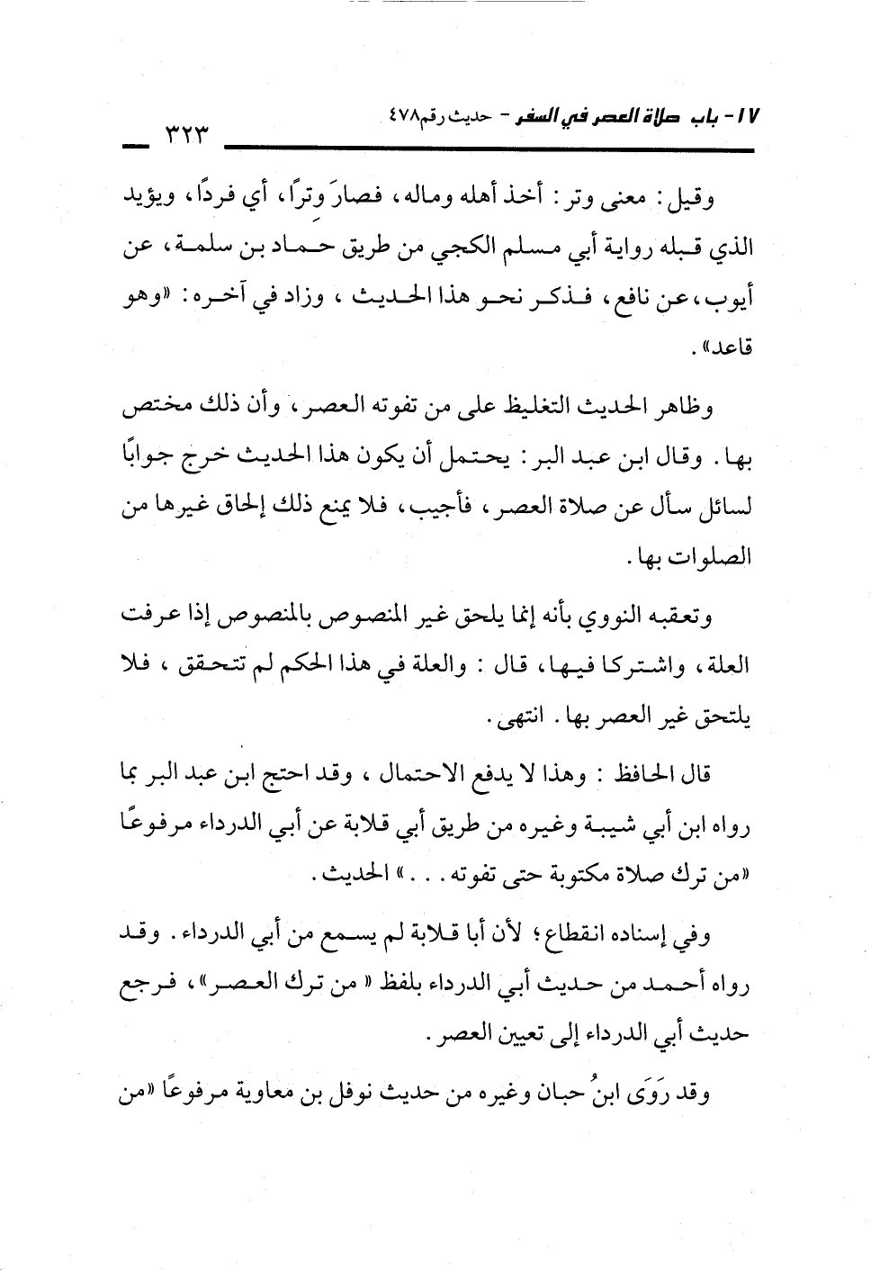 وظاهر الحديث التغليظ على من تفوته العصر، وأن ذلك مختص بها. وقال ابن عبد البر: يحتمل أن يكون هذا الحديث خرج جوابًا لسائل سأل عن صلاة العصر، فأجيب، فلا يمنع ذلك إلحاق غيرها من الصلوات بها.