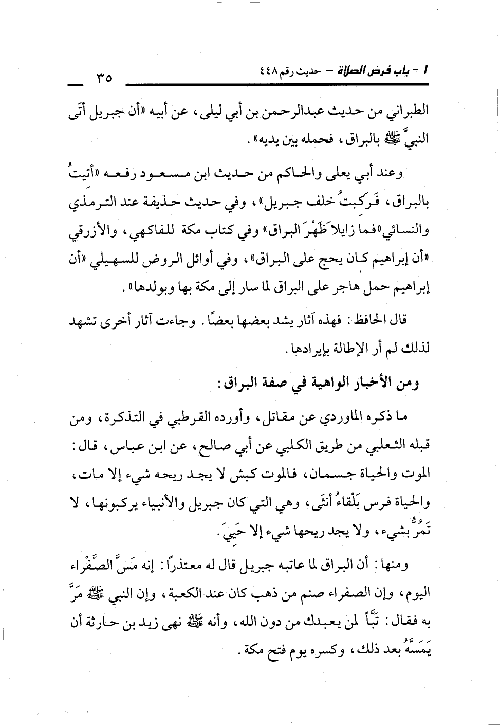 وعند أبي يعلى والحاكم من حديث ابن مسعود رفعه "أتِيتُ بالبراق، فَرَكبتُ خلف جبريل"، وفي حديث حذيفة عند الترمذي والنسائي "فماَ زايلاَ ظَهْرَ البراق" وفي كتاب مكة للفاكهي، والأزرقي "أن إبراهيم كان يحج على البراق"، وفي أوائل الروض للسهيلي "أن إبراهيم حمل هاجر على البراق لما سار إلى مكة بها وبولدها".