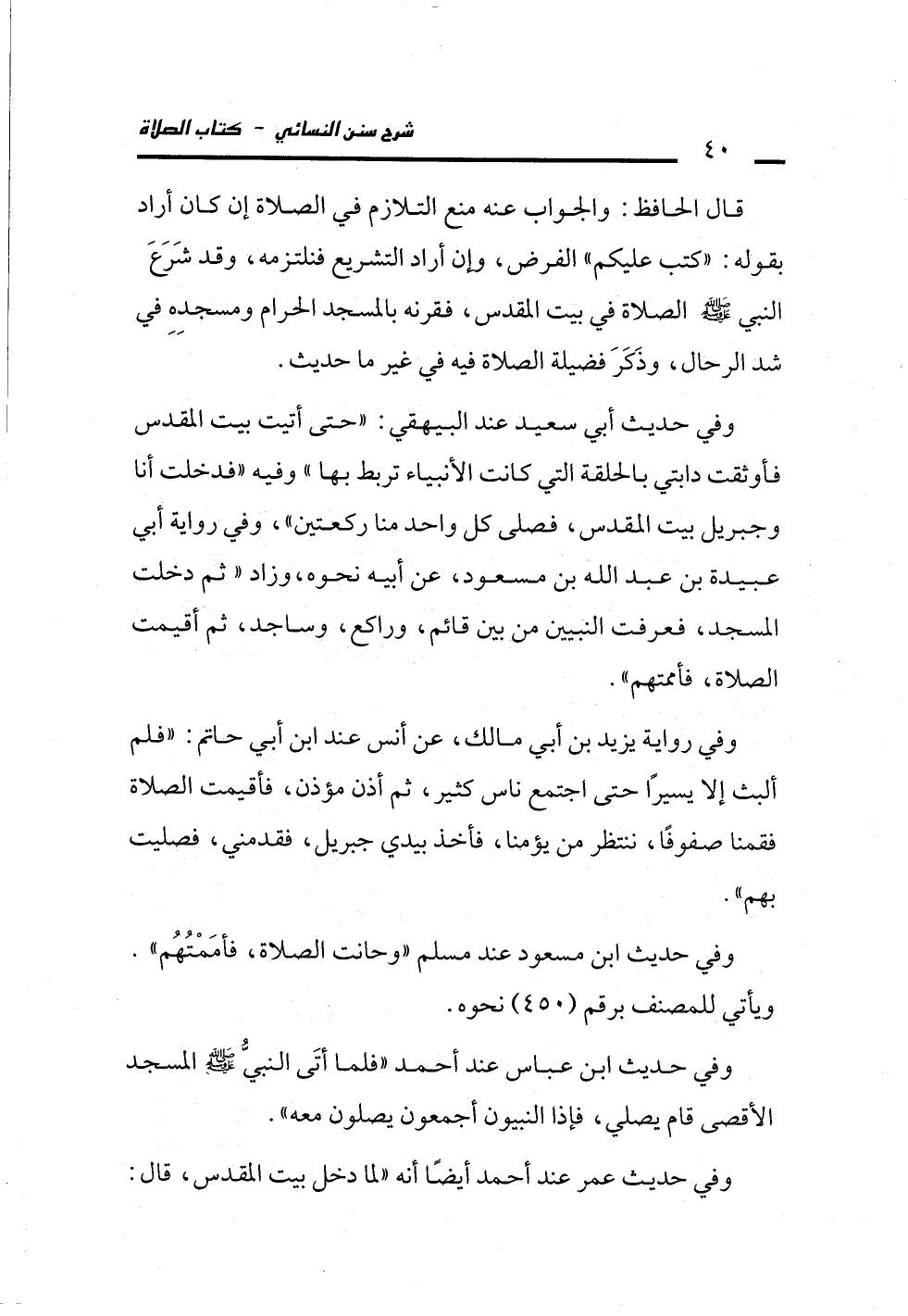 وفي حديث ابن عباس عند أحمد "فلما أتَى النبيُّ - صلى الله عليه وسلم - المسجد الأقصى قام يصلي، فإذا النبيون أجمعون يصلون معه".