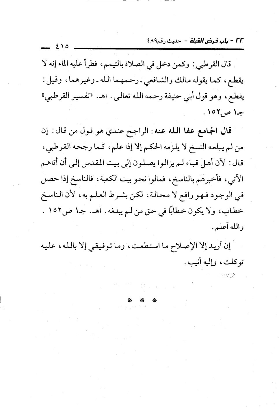 قال الجامع عفا الله عنه: الراجح عندي هو قول من قال: إن من لم يبلغه النسخ لا يلزمه الحكم إلا إذا علم، كما رجحه القرطبي، قال: لأن أهل قباء لم يزالوا يصلون إلى بيت المقدس إلى أن أتاهم الآتي، فأخبرهم بالناسخ، فمالوا نحو بيت الكعبة، فالناسخ إذا حصل