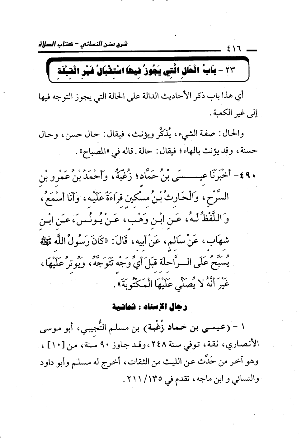 490 - أَخْبَرَنَا عِيسَى بْنُ حَمَّادٍ، زُغْبَةُ، وَأَحْمَدُ بْنُ عَمْرِو بْنِ السَّرْحِ، وَالْحَارِثُ بْنُ مِسْكِينٍ قِرَاءَةً عَلَيْهِ، وَأَنَا أَسْمَعُ، وَاللَّفْظُ لَهُ، عَنِ ابْنِ وَهْبٍ، عَنْ يُونُسَ، عَنِ ابْنِ شِهَابٍ، عَنْ سَالِمٍ، عَنْ أَبِيهِ، قَالَ: "كَانَ رَسُولُ اللهِ - صلى الله عليه وسلم - يُسَبِّحُ عَلَى الرَّاحِلَةِ قِبَلَ أَيِّ وَجْهٍ تَتَوَجَّهُ، وَيُوتِرُ عَلَيْهَا، غَيْرَ أَنَّهُ لاَ يُصَلِّي عَلَيْهَا الْمَكْتُوبَةَ".