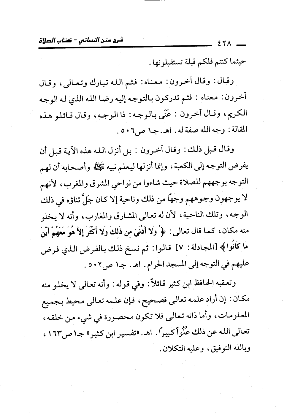 وقال قبل ذلك: وقال آخرون: بل أنزل الله هذه الآية قبل أن يفرض التوجه إلى الكعبة، وإنما أنزلها ليعلم نبيه - صلى الله عليه وسلم - وأصحابه أن لهم التوجه بوجههم للصلاة حيث شاءوا من نواحي المشرق والمغرب، لأنهم لا يوجهون وجوههم وجهًا من ذلك وناحية إلا كان جَلَّ ثناؤه في ذلك الوجه، وتلك الناحية، لأن له تعالى المشارق والمغارب، وأنه لا يخلو منه مكان، كما قال تعالى: {وَلَا أَدْنَى مِنْ ذَلِكَ وَلَا أَكْثَرَ إِلَّا هُوَ مَعَهُمْ أَيْنَ مَا كَانُوا} [المجادلة: 7] قالوا: ثم نسخ ذلك بالفرض الذي فرض عليهم في التوجه إلى المسجد الحرام. اهـ. جـ 1 ص 502.