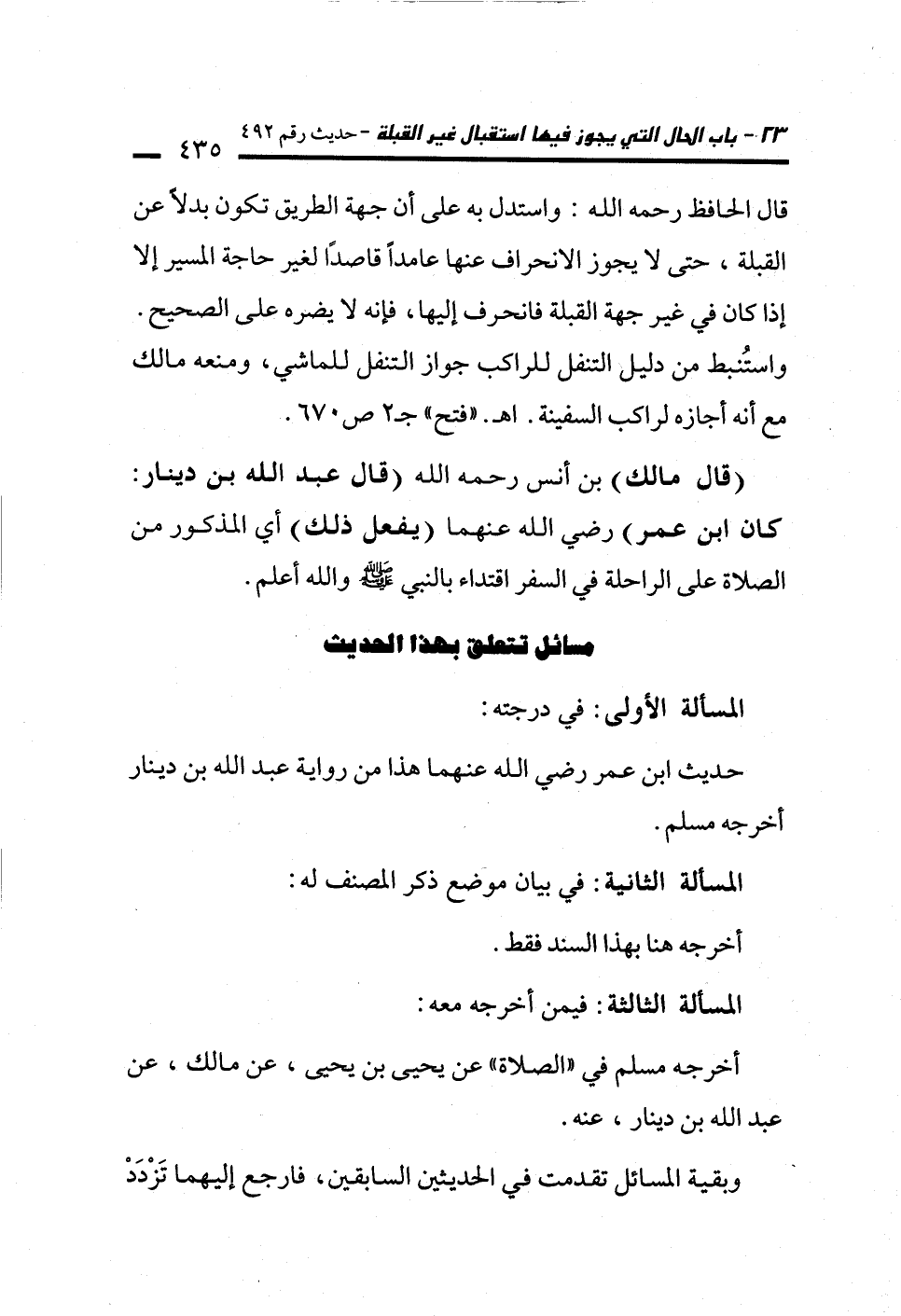 قال الحافظ رحمه الله: واستدل به على أن جهة الطريق تكون بدلًا عن القبلة، حتى لا يجوز الانحراف عنها عامدًا قاصدًا لغير حاجة المسير إلا إذا كان في غير جهة القبلة فانحرف إليها، فإنه لا يضره على الصحيح. واستُنبط من دليل التنفل للراكب جواز التنفل للماشي، ومنعه مالك مع أنه أجازه لراكب السفينة. اهـ. "فتح" جـ 2 ص 670.