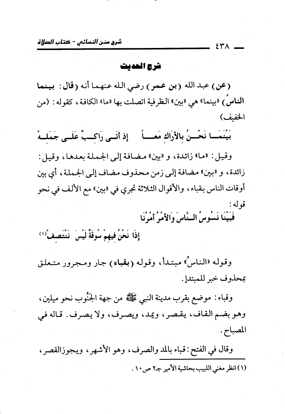 (عن) عبد الله (بن عمر) رضي الله عنهما أنه (قال: بينما الناسُ) "بينما" هي "بين" الظرفية اتصلت بها "ما" الكافة، كقوله: (من الخفيف)