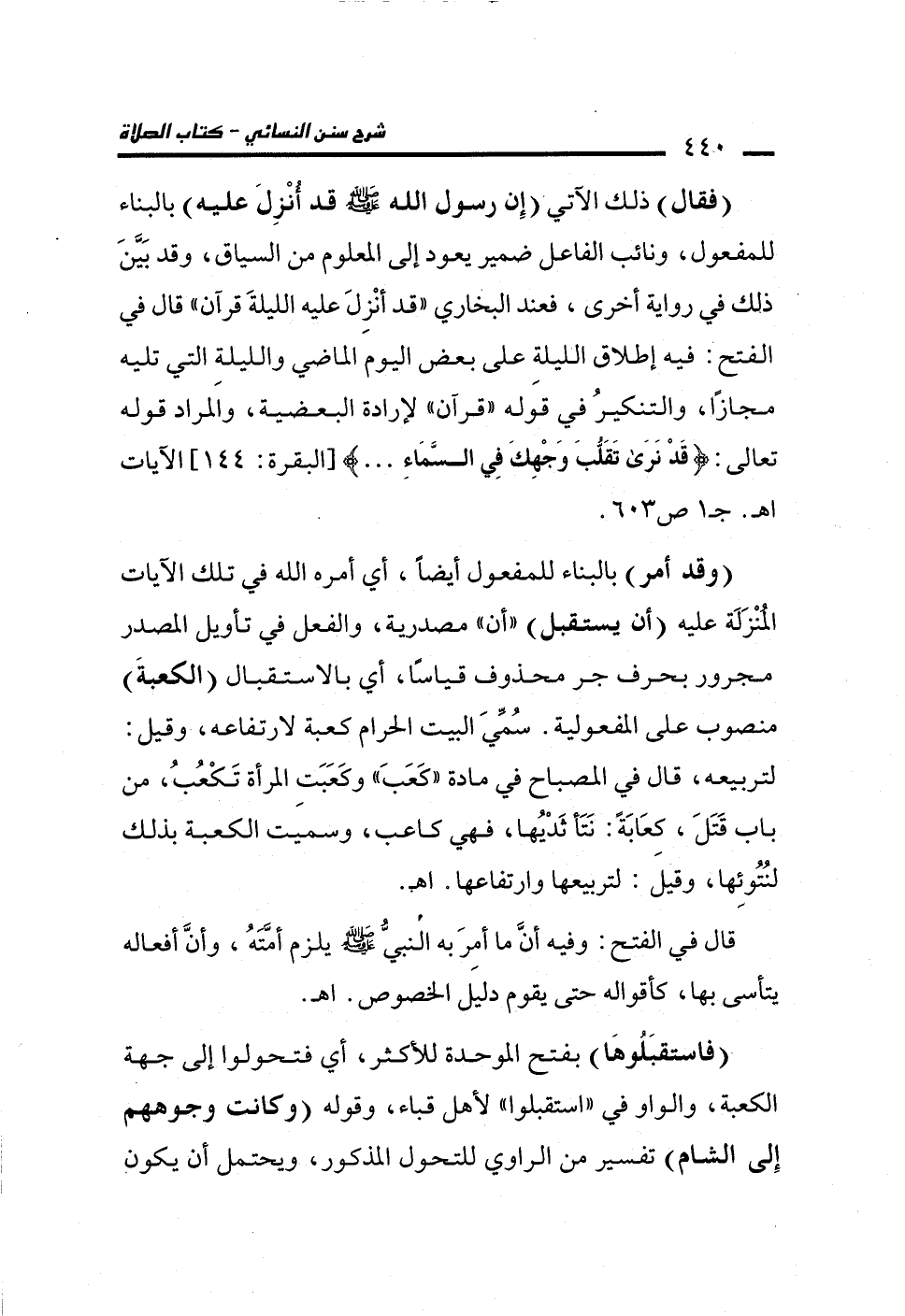 (وقد أمر) بالبناء للمفعول أيضًا، أي أمره الله في تلك الآيات المُنْزَلَة عليه (أن يستقبل) "أن" مصدرية، والفعل في تأويل المصدر مجرور بحرف جر محذوف قياسًا، أي بالاستقبال (الكعبةَ) منصوب على المفعولية. سُمِّيَ البيت الحرام كعبة لارتفاعه، وقيل: لتربيعه، قال في المصباح في مادة "كَعَبَ" وكَعَبَت المرأة تَكْعُبُ، من باب قَتَلَ، كِعَابَةً: نَتَأ ثَدْيُها، فهي كاعب، وسميت الكعبة بذلك لنُتُوْئِها، وقيل: لتربيعها وارتفاعها. اهـ.