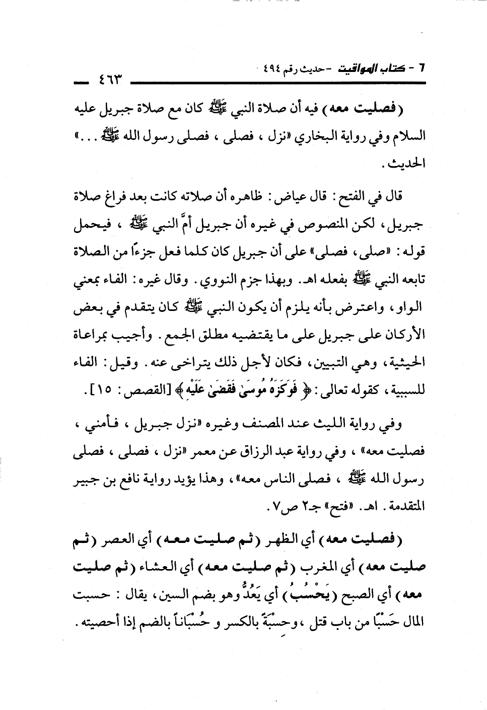 قال في الفتح: قال عياض: ظاهره أن صلاته كانت بعد فراغ صلاة جبريل، لكن المنصوص في غيره أن جبريل أمَّ النبي - صلى الله عليه وسلم -، فيحمل قوله: "صلى، فصلى" على أن جبريل كان كلما فعل جزءًا من الصلاة تابعه النبي - صلى الله عليه وسلم - بفعله اهـ. وبهذا جزم النووي. وقال غيره: الفاء بمعني الواو، واعترض بأنه يلزم أن يكون النبي - صلى الله عليه وسلم - كان يتقدم في بعض الأركان على جبريل على ما يقتضيه مطلق الجمع. وأجيب بمراعاة