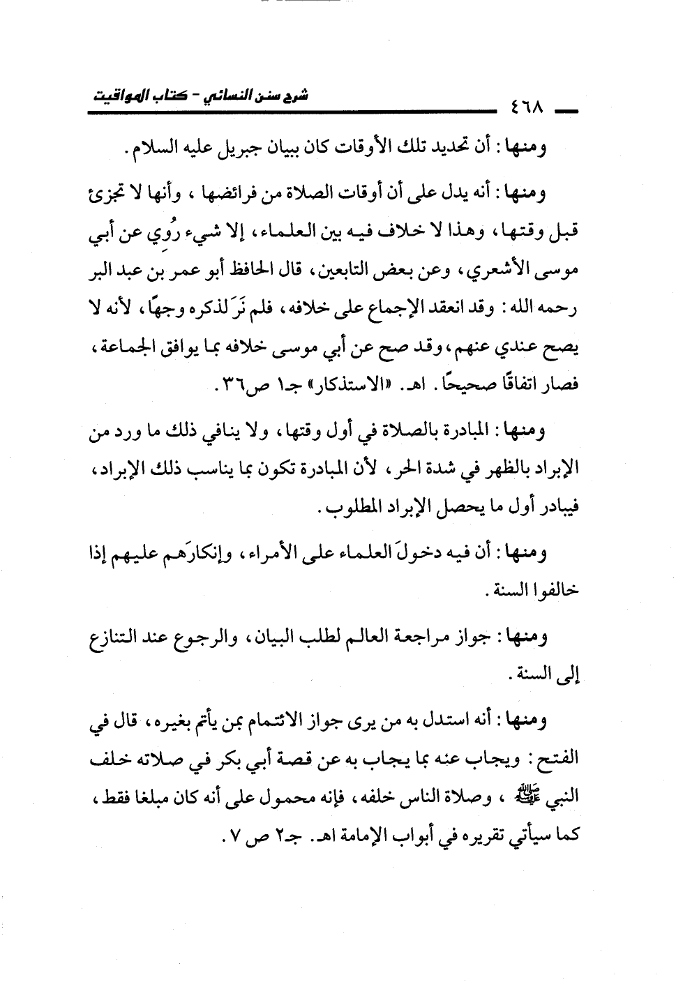 ومنها: أنه يدل على أن أوقات الصلاة من فرائضها، وأنها لا تجزىء قبل وقتها، وهذا لا خلاف فيه بين العلماء، إلا شيء رُوِي عن أبي موسى الأشعري، وعن بعض التابعين، قال الحافظ أبو عمر بن عبد البر رحمه الله: وقد انعقد الإجماع على خلافه، فلم نَرَ لذكره وجهًا، لأنه لا يصح عندي عنهم، وقد صح عن أبي موسى خلافه بما يوافق الجماعة، فصار اتفاقًا صحيحًا. اهـ. "الاستذكار" جـ 1 ص 36.
