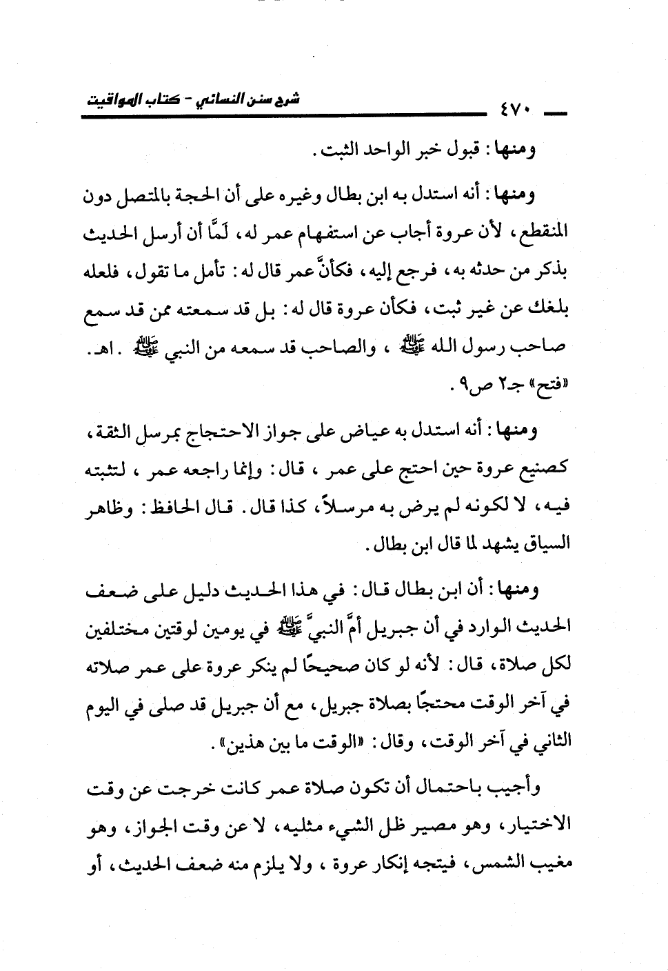ومنها: أن ابن بطال قال: في هذا الحديث دليل على ضعف الحديث الوارد في أن جبريل أمَّ النبي - صلى الله عليه وسلم - في يومين لوقتين مختلفين لكل صلاة، قال: لأنه لو كان صحيحًا لم ينكر عروة على عمر صلاته في آخر الوقت محتجًا بصلاة جبريل، مع أن جبريل قد صلى في اليوم الثاني في آخر الوقت، وقال: "الوقت ما بين هذين".