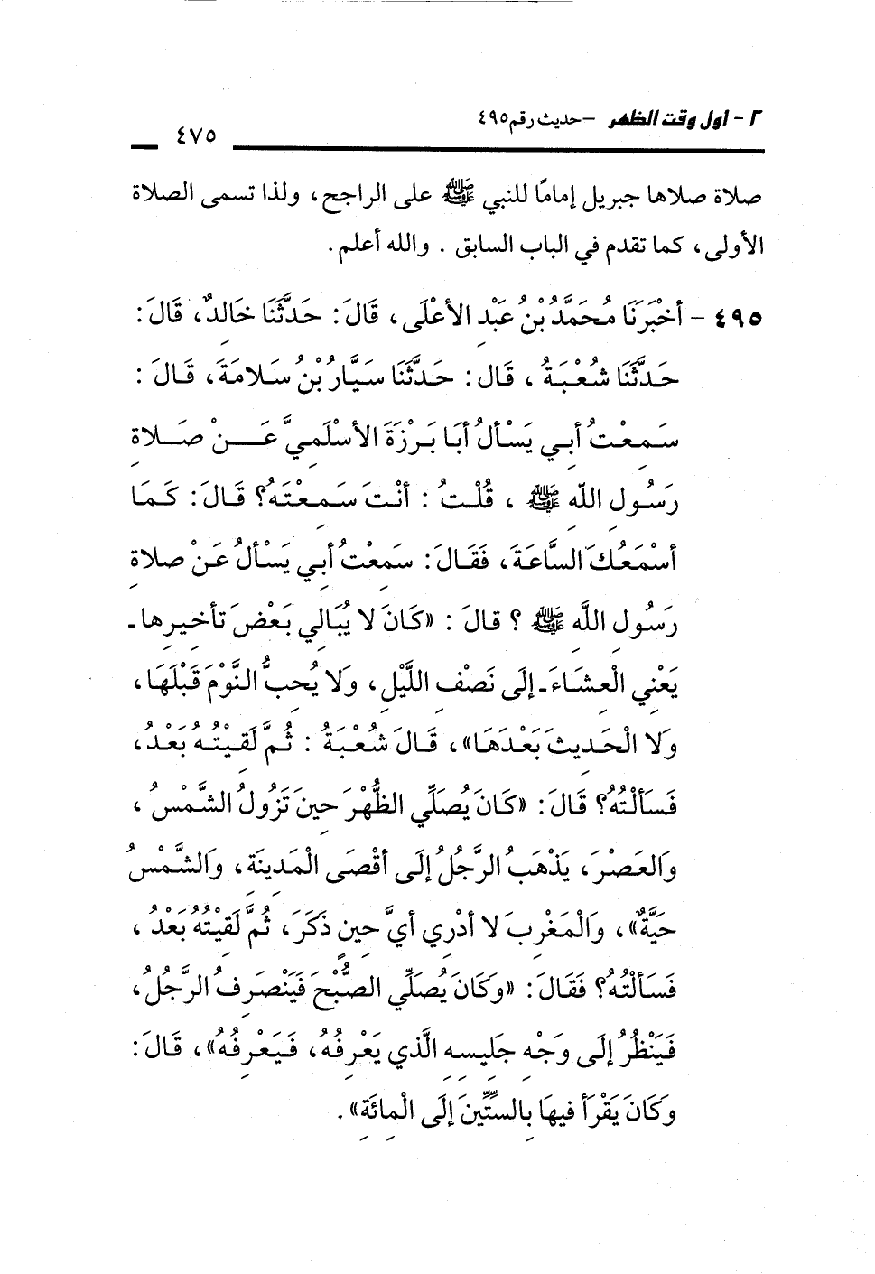 495 - أَخْبَرَنَا مُحَمَّدُ بْنُ عَبْدِ الأَعْلَى، قَالَ: حَدَّثَنَا خَالِدٌ، قَالَ: حَدَّثَنَا شُعْبَةُ، قَالَ: حَدَّثَنَا سَيَّارُ بْنُ سَلاَمَةَ، قَالَ: سَمِعْتُ أَبِي يَسْأَلُ أَبَا بَرْزَةَ عَنْ صَلاَةِ رَسُولِ اللهِ - صلى الله عليه وسلم -، قُلْتُ: أَنْتَ سَمِعْتَهُ؟ قَالَ: كَمَا أَسْمَعُكَ السَّاعَةَ، فَقَالَ: سَمِعْتُ أَبِي يَسْأَلُ عَنْ صَلاَةِ رَسُولِ اللهِ - صلى الله عليه وسلم - قَالَ: كَانَ لاَ يُبَالِي بَعْضَ تَأْخِيرِهَا -يَعْنِى الْعِشَاءَ- إِلَى نِصْفِ اللَّيْلِ، وَلاَ يُحِبُّ النَّوْمَ قَبْلَهَا، وَلاَ الْحَدِيثَ بَعْدَهَا". قَالَ شُعْبَةُ: ثُمَّ لَقِيتُهُ بَعْدُ، فَسَأَلْتُهُ؟ قَالَ: "كَانَ يُصَلِّي الظُّهْرَ حِينَ تَزُولُ الشَّمْسُ، وَالْعَصْرَ، يَذْهَبُ الرَّجُلُ إِلَى أَقْصَى الْمَدِينَةِ، وَالشَّمْسُ حَيَّةٌ"، وَالْمَغْرِبَ لاَ أَدْرِي أَيَّ حِينٍ ذَكَرَ، ثُمَّ لَقِيتُهُ بَعْدُ، فَسَأَلْتُهُ؟ فَقَالَ: "وَكَانَ يُصَلِّي الصُّبْحَ فَيَنْصَرِفُ الرَّجُلُ، فَيَنْظُرُ إِلَى وَجْهِ جَلِيسِهِ الَّذِي يَعْرِفُهُ، فَيَعْرِفُهُ"، قَالَ: وَكَانَ يَقْرَأُ فِيهَا بِالسِّتِّينَ إِلَى الْمِائَةِ".