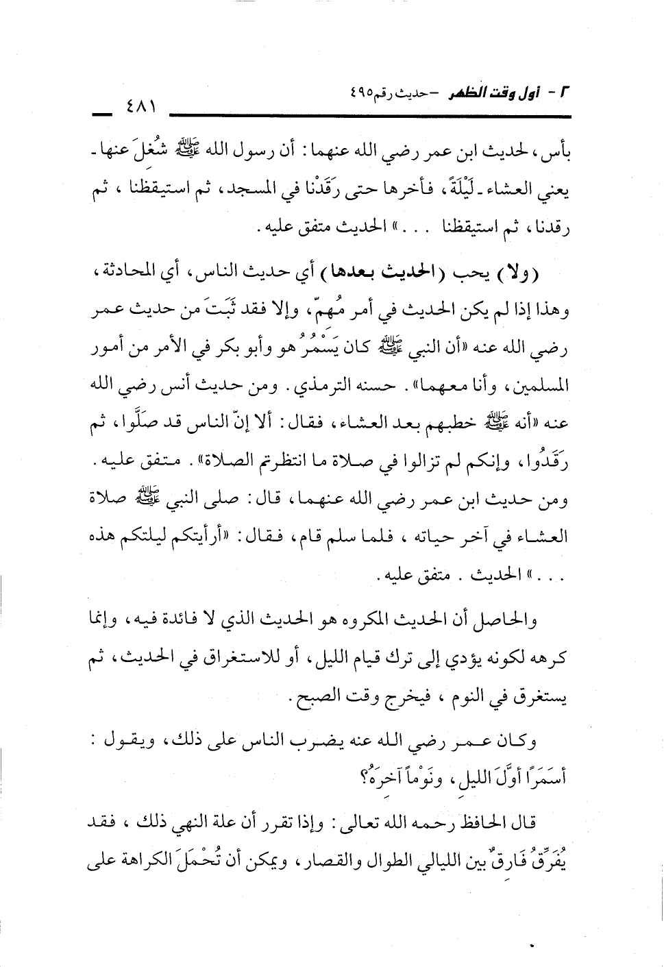 (ولا) يحب (الحديث بعدها) أي حديث الناس، أي المحادثة، وهذا إذا لم يكن الحديث في أمر مُهِمّ، وإلا فقد ثَبَتَ من حديث عمر رضي الله عنه "أن النبي - صلى الله عليه وسلم - كان يَسْمُرُ هو وأبو بكر في الأمر من أمور المسلمين، وأنا معهما". حسنه الترمذي. ومن حديث أنس رضي الله عنه "أنه - صلى الله عليه وسلم - خطبهم بعد العشاء، فقال: ألا إنّ الناس قد صَلَّوا، ثم رَقَدُوا" وإنكم لم تزالوا في صلاة ما انتظرتم الصلاة". متفق عليه. ومن حديث ابن عمر رضي الله عنهما، قال: صلى النبي - صلى الله عليه وسلم - صلاة العشاء في آخر حياته، فلما سلم قام، فقال: "أرأيتكم ليلتكم هذه ... " الحديث. متفق عليه.